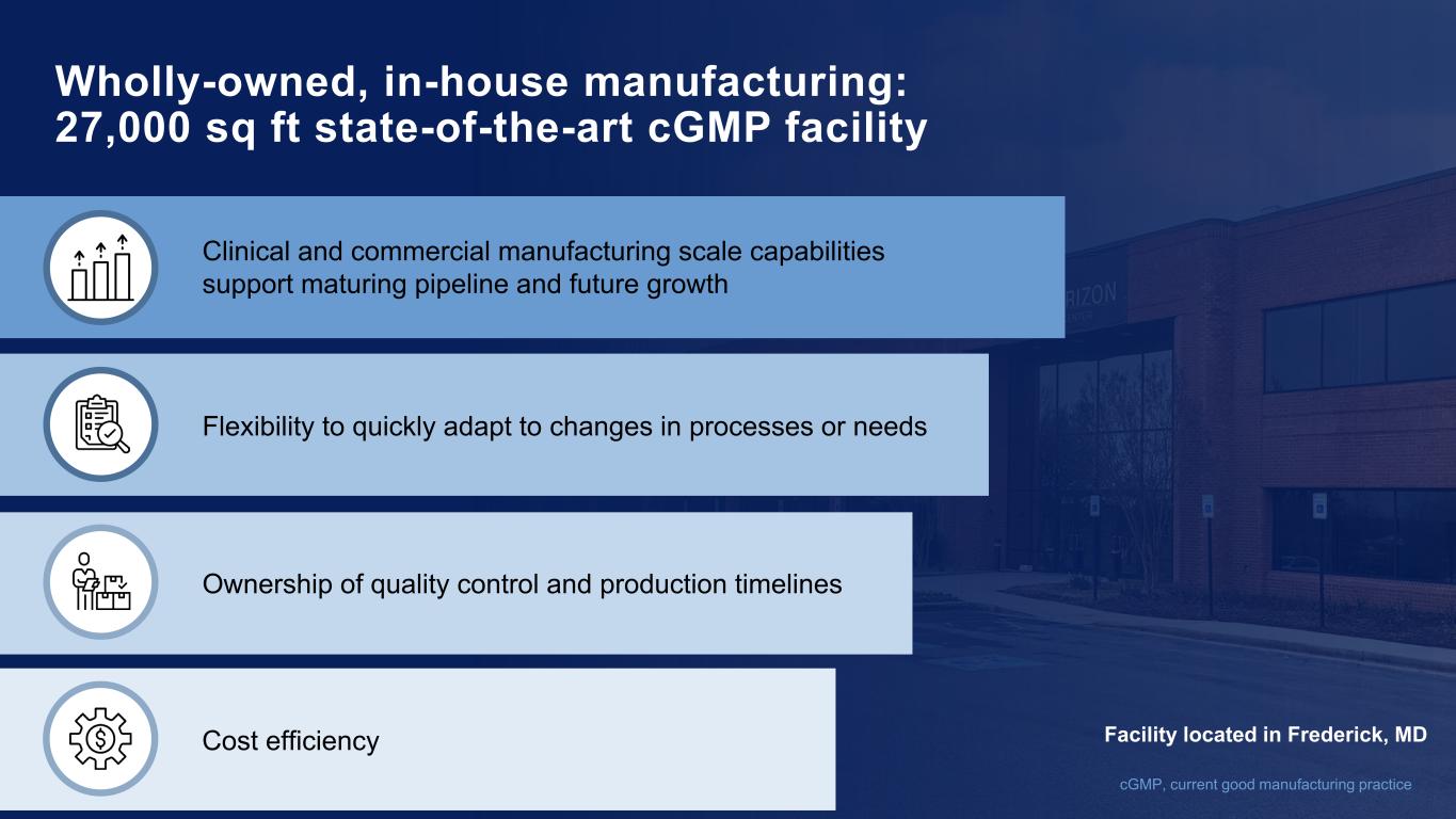 Wholly-owned, in-house manufacturing: 27,000 sq ft state-of-the-art cGMP facility Ownership of quality control and production timelines Flexibility to quickly adapt to changes in processes or needs Cost efficiency Clinical and commercial manufacturing scale capabilities support maturing pipeline and future growth cGMP, current good manufacturing practice Facility located in Frederick, MD