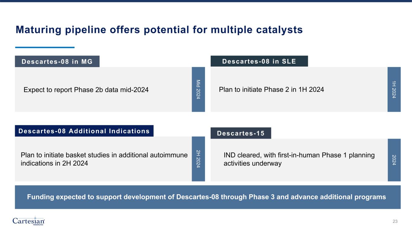 Maturing pipeline offers potential for multiple catalysts 23 Descartes-08 in MG Descartes-08 in SLE Descartes-08 Additional Indications Descartes-15 Expect to report Phase 2b data mid-2024 Plan to initiate Phase 2 in 1H 2024 Plan to initiate basket studies in additional autoimmune indications in 2H 2024 IND cleared, with first-in-human Phase 1 planning activities underway M id 2024 1H 2024 2H 2024 2024 Funding expected to support development of Descartes-08 through Phase 3 and advance additional programs