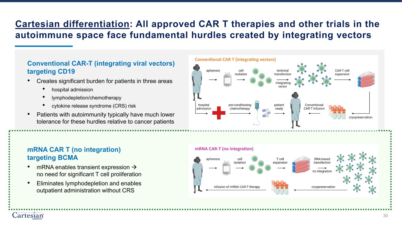 Cartesian differentiation: All approved CAR T therapies and other trials in the autoimmune space face fundamental hurdles created by integrating vectors 30 Conventional CAR-T (integrating viral vectors) targeting CD19 • Creates significant burden for patients in three areas • hospital admission • lymphodepletion/chemotherapy • cytokine release syndrome (CRS) risk • Patients with autoimmunity typically have much lower tolerance for these hurdles relative to cancer patients mRNA CAR T (no integration) targeting BCMA • mRNA enables transient expression  no need for significant T cell proliferation • Eliminates lymphodepletion and enables outpatient administration without CRS