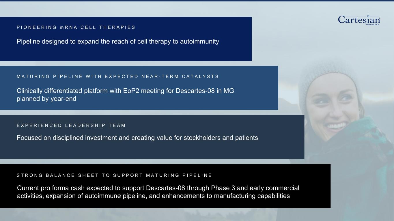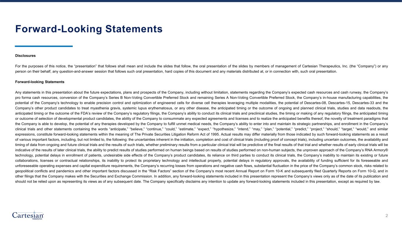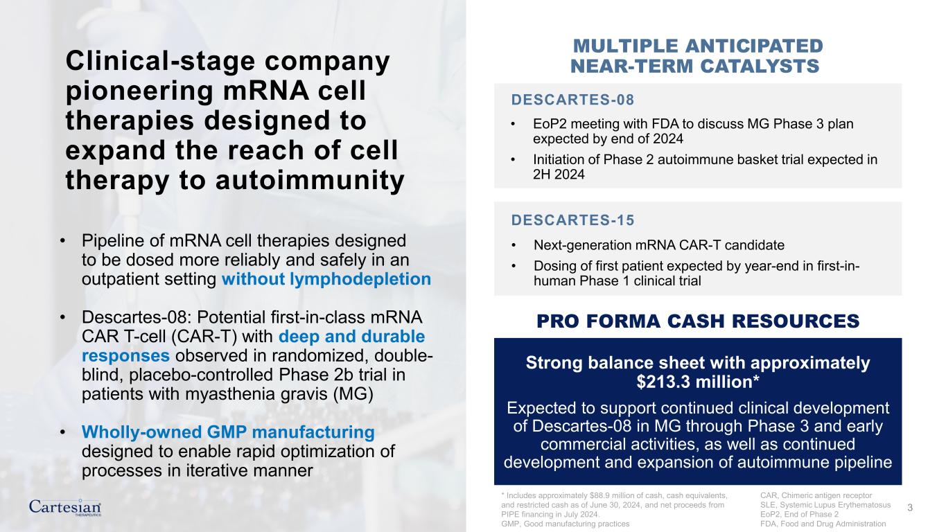 Forward-Looking Statements Disclosures For the purposes of this notice, the “presentation” that follows shall mean and include the slides that follow, the oral presentation of the slides by members of management of Cartesian Therapeutics, Inc. (the “Company”) or any person on their behalf, any question-and-answer session that follows such oral presentation, hard copies of this document and any materials distributed at, or in connection with, such oral presentation. Forward-looking Statements Any statements in this presentation about the future expectations, plans and prospects of the Company, including without limitation, statements regarding the Company’s expected cash resources and cash runway, the Company’s pro forma cash resources, conversion of the Company’s Series B Non-Voting Convertible Preferred Stock and remaining Series A Non-Voting Convertible Preferred Stock, the Company’s in-house manufacturing capabilities, the potential of the Company’s technology to enable precision control and optimization of engineered cells for diverse cell therapies leveraging multiple modalities, the potential of Descartes-08, Descartes-15, Descartes-33 and the Company’s other product candidates to treat myasthenia gravis, systemic lupus erythematosus, or any other disease, the anticipated timing or the outcome of ongoing and planned clinical trials, studies and data readouts, the anticipated timing or the outcome of the FDA’s review of the Company’s regulatory filings, the Company’s ability to conduct its clinical trials and preclinical studies, the timing or making of any regulatory filings, the anticipated timing or outcome of selection of developmental product candidates, the ability of the Company to consummate any expected agreements and licenses and to realize the anticipated benefits thereof, the novelty of treatment paradigms that the Company is able to develop, the potential of any therapies developed by the Company to fulfill unmet medical needs, the Company’s ability to enter into and maintain its strategic partnerships, and enrollment in the Company’s clinical trials and other statements containing the words “anticipate,” “believe,” “continue,” “could,” “estimate,” “expect,” “hypothesize,” “intend,” “may,” “plan,” “potential,” “predict,” “project,” “should,” “target,” “would,” and similar expressions, constitute forward-looking statements within the meaning of The Private Securities Litigation Reform Act of 1995. Actual results may differ materially from those indicated by such forward-looking statements as a result of various important factors, including, but not limited to, the following: the uncertainties inherent in the initiation, completion and cost of clinical trials (including proof of concept trials), including uncertain outcomes, the availability and timing of data from ongoing and future clinical trials and the results of such trials, whether preliminary results from a particular clinical trial will be predictive of the final results of that trial and whether results of early clinical trials will be indicative of the results of later clinical trials, the ability to predict results of studies performed on human beings based on results of studies performed on non-human subjects, the unproven approach of the Company’s RNA Armory® technology, potential delays in enrollment of patients, undesirable side effects of the Company’s product candidates, its reliance on third parties to conduct its clinical trials, the Company’s inability to maintain its existing or future collaborations, licenses or contractual relationships, its inability to protect its proprietary technology and intellectual property, potential delays in regulatory approvals, the availability of funding sufficient for its foreseeable and unforeseeable operating expenses and capital expenditure requirements, the Company’s recurring losses from operations and negative cash flows, substantial fluctuation in the price of the Company’s common stock, risks related to geopolitical conflicts and pandemics and other important factors discussed in the “Risk Factors” section of the Company’s most recent Annual Report on Form 10-K and subsequently filed Quarterly Reports on Form 10-Q, and in other filings that the Company makes with the Securities and Exchange Commission. In addition, any forward-looking statements included in this presentation represent the Company’s views only as of the date of its publication and should not be relied upon as representing its views as of any subsequent date. The Company specifically disclaims any intention to update any forward-looking statements included in this presentation, except as required by law. 2