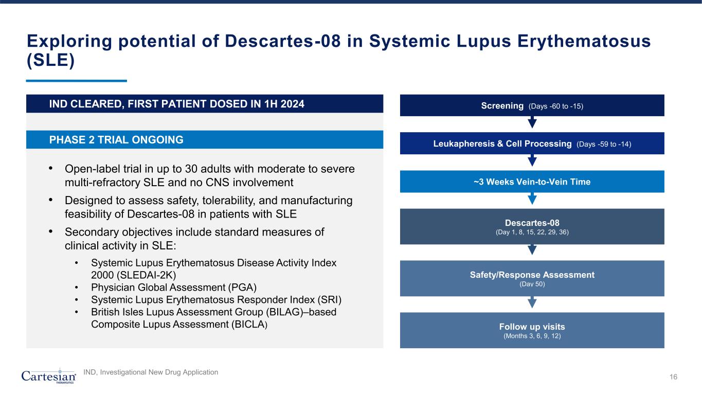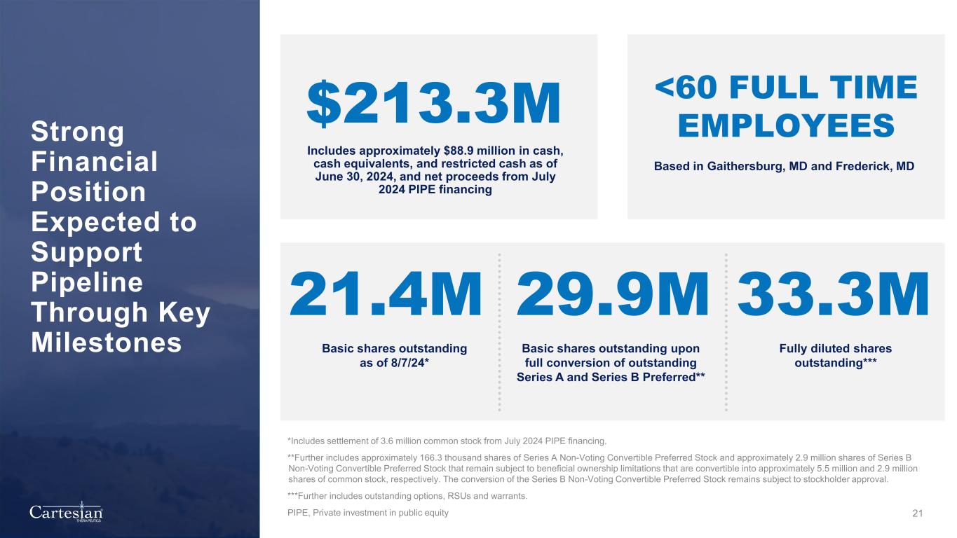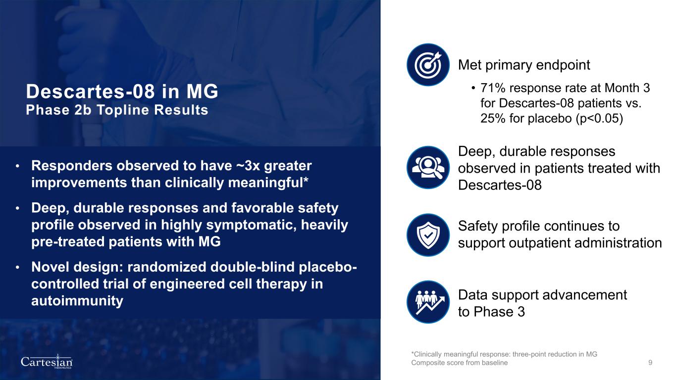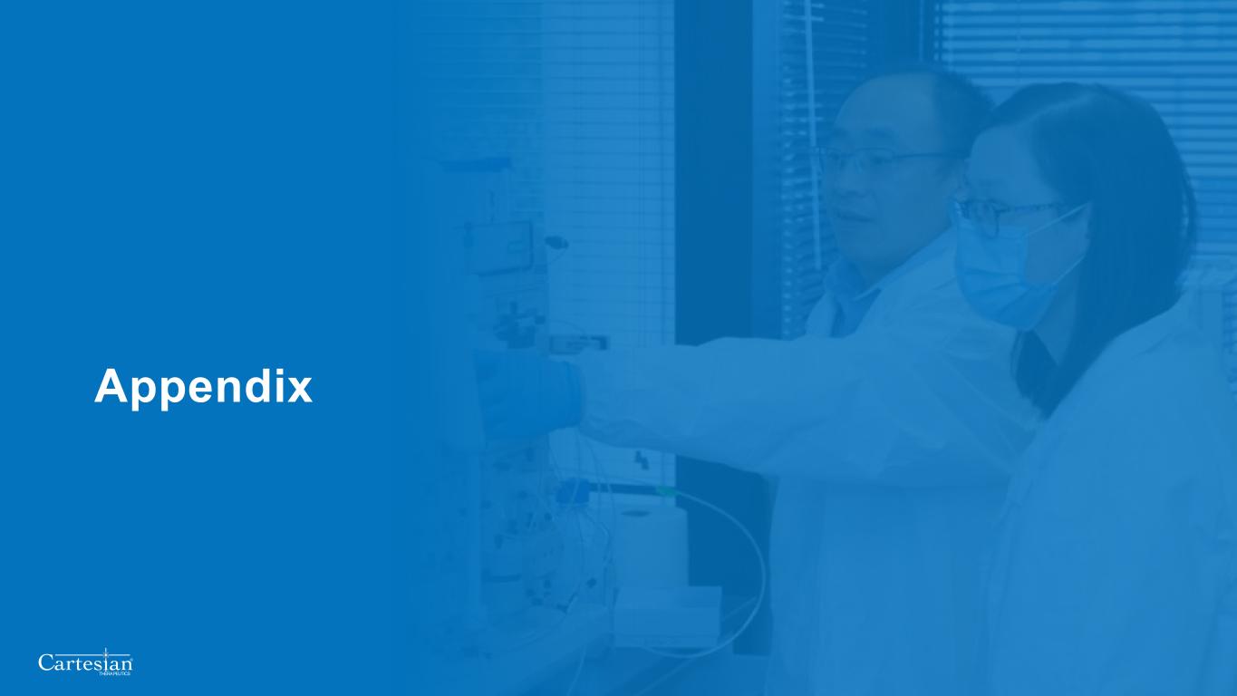 Forward-Looking Statements Disclosures For the purposes of this notice, the “presentation” that follows shall mean and include the slides that follow, the oral presentation of the slides by members of management of Cartesian Therapeutics, Inc. (the “Company”) or any person on their behalf, any question-and-answer session that follows such oral presentation, hard copies of this document and any materials distributed at, or in connection with, such oral presentation. Forward-looking Statements Any statements in this presentation about the future expectations, plans and prospects of the Company, including without limitation, statements regarding the Company’s expected cash resources and cash runway, the Company’s pro forma cash resources, conversion of the Company’s Series B Non-Voting Convertible Preferred Stock and remaining Series A Non-Voting Convertible Preferred Stock, the Company’s in-house manufacturing capabilities, the potential of the Company’s technology to enable precision control and optimization of engineered cells for diverse cell therapies leveraging multiple modalities, the potential of Descartes-08, Descartes-15, Descartes-33 and the Company’s other product candidates to treat myasthenia gravis, systemic lupus erythematosus, or any other disease, the anticipated timing or the outcome of ongoing and planned clinical trials, studies and data readouts, the anticipated timing or the outcome of the FDA’s review of the Company’s regulatory filings, the Company’s ability to conduct its clinical trials and preclinical studies, the timing or making of any regulatory filings, the anticipated timing or outcome of selection of developmental product candidates, the ability of the Company to consummate any expected agreements and licenses and to realize the anticipated benefits thereof, the novelty of treatment paradigms that the Company is able to develop, the potential of any therapies developed by the Company to fulfill unmet medical needs, the Company’s ability to enter into and maintain its strategic partnerships, and enrollment in the Company’s clinical trials and other statements containing the words “anticipate,” “believe,” “continue,” “could,” “estimate,” “expect,” “hypothesize,” “intend,” “may,” “plan,” “potential,” “predict,” “project,” “should,” “target,” “would,” and similar expressions, constitute forward-looking statements within the meaning of The Private Securities Litigation Reform Act of 1995. Actual results may differ materially from those indicated by such forward-looking statements as a result of various important factors, including, but not limited to, the following: the uncertainties inherent in the initiation, completion and cost of clinical trials (including proof of concept trials), including uncertain outcomes, the availability and timing of data from ongoing and future clinical trials and the results of such trials, whether preliminary results from a particular clinical trial will be predictive of the final results of that trial and whether results of early clinical trials will be indicative of the results of later clinical trials, the ability to predict results of studies performed on human beings based on results of studies performed on non-human subjects, the unproven approach of the Company’s RNA Armory® technology, potential delays in enrollment of patients, undesirable side effects of the Company’s product candidates, its reliance on third parties to conduct its clinical trials, the Company’s inability to maintain its existing or future collaborations, licenses or contractual relationships, its inability to protect its proprietary technology and intellectual property, potential delays in regulatory approvals, the availability of funding sufficient for its foreseeable and unforeseeable operating expenses and capital expenditure requirements, the Company’s recurring losses from operations and negative cash flows, substantial fluctuation in the price of the Company’s common stock, risks related to geopolitical conflicts and pandemics and other important factors discussed in the “Risk Factors” section of the Company’s most recent Annual Report on Form 10-K and subsequently filed Quarterly Reports on Form 10-Q, and in other filings that the Company makes with the Securities and Exchange Commission. In addition, any forward-looking statements included in this presentation represent the Company’s views only as of the date of its publication and should not be relied upon as representing its views as of any subsequent date. The Company specifically disclaims any intention to update any forward-looking statements included in this presentation, except as required by law. 2