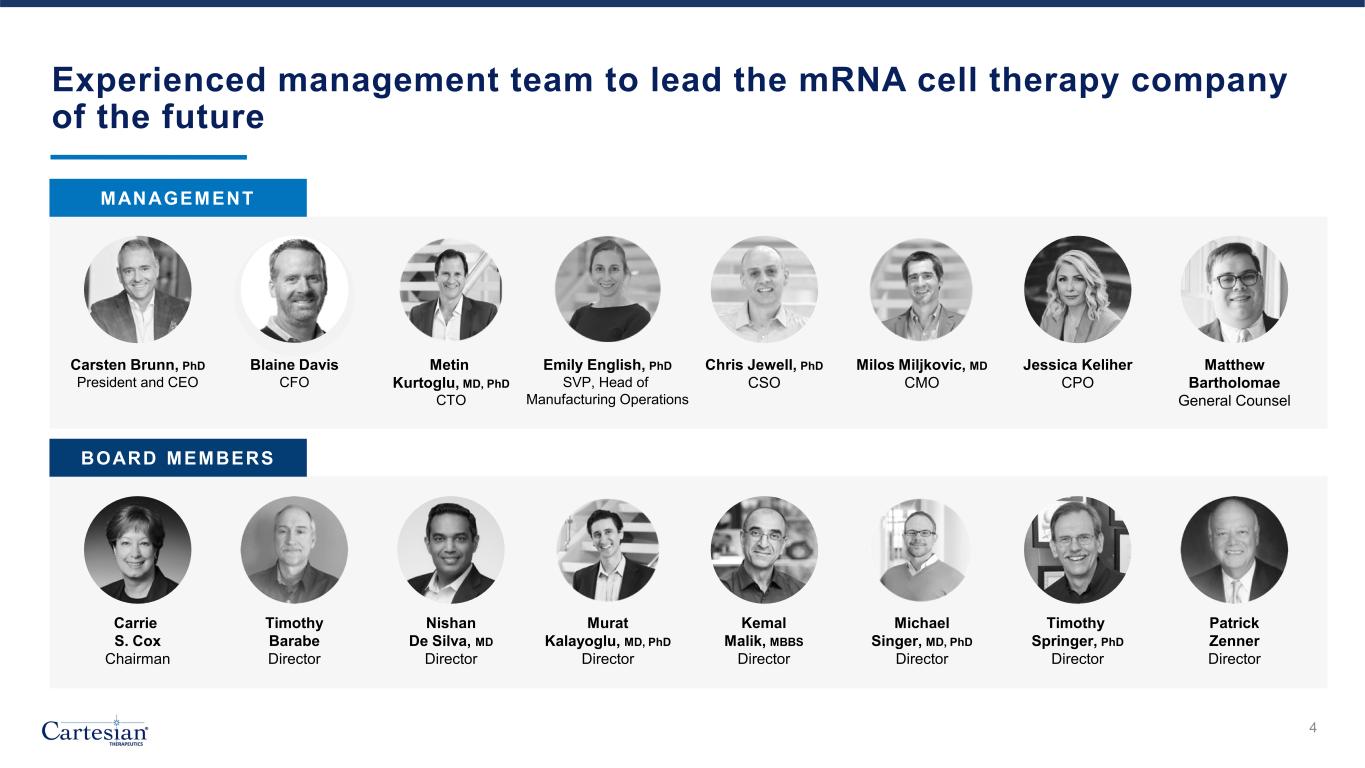 3 Clinical-stage company pioneering mRNA cell therapies designed to expand the reach of cell therapy to autoimmunity • Pipeline of mRNA cell therapies designed to be dosed more reliably and safely in an outpatient setting without lymphodepletion • Descartes-08: Potential first-in-class mRNA CAR T-cell (CAR-T) with deep and durable responses observed in randomized, double- blind, placebo-controlled Phase 2b trial in patients with myasthenia gravis (MG) • Wholly-owned GMP manufacturing designed to enable rapid optimization of processes in iterative manner MULTIPLE ANTICIPATED NEAR-TERM CATALYSTS Strong balance sheet with approximately $213.3 million* Expected to support continued clinical development of Descartes-08 in MG through Phase 3 and early commercial activities, as well as continued development and expansion of autoimmune pipeline PRO FORMA CASH RESOURCES • EoP2 meeting with FDA to discuss MG Phase 3 plan expected by end of 2024 • Initiation of Phase 2 autoimmune basket trial expected in 2H 2024 DESCARTES-08 • Next-generation mRNA CAR-T candidate • Dosing of first patient expected by year-end in first-in- human Phase 1 clinical trial DESCARTES-15 CAR, Chimeric antigen receptor SLE, Systemic Lupus Erythematosus EoP2, End of Phase 2 FDA, Food and Drug Administration * Includes approximately $88.9 million of cash, cash equivalents, and restricted cash as of June 30, 2024, and net proceeds from PIPE financing in July 2024. GMP, Good manufacturing practices