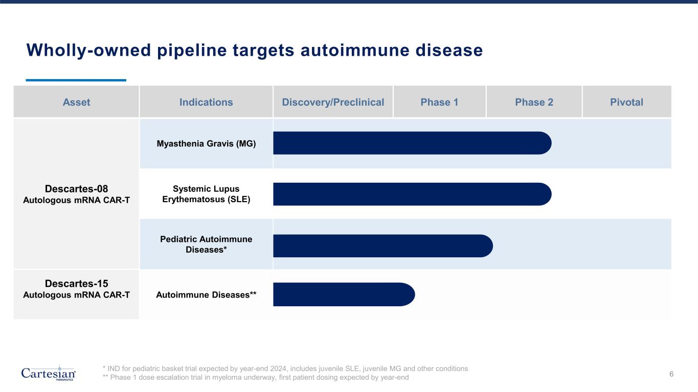 • mRNA cell therapy does not require lymphodepleting chemotherapy • No associated cytopenia, secondary malignancies, or other chemotherapy toxicities • Reduced burden on patients, caregivers, and healthcare system • Convenient dosing schedule Cartesian’s mRNA approach is designed to expand the reach of potent cell therapy products to address autoimmunity Administered Outpatient No Lymphodepletion • Administered at therapeutic doses without uncontrollable proliferation • Transient CAR protein expression due to mRNA degradation and natural dilution Delivered at Therapeutic Levels • mRNA does not replicate and allows for more predictable response • Does not carry risk of genomic integration Transient Cell Modification • Control over product quality and production • Autologous approach with approximately three weeks from apheresis to first infusion In-House cGMP Manufacturing 5