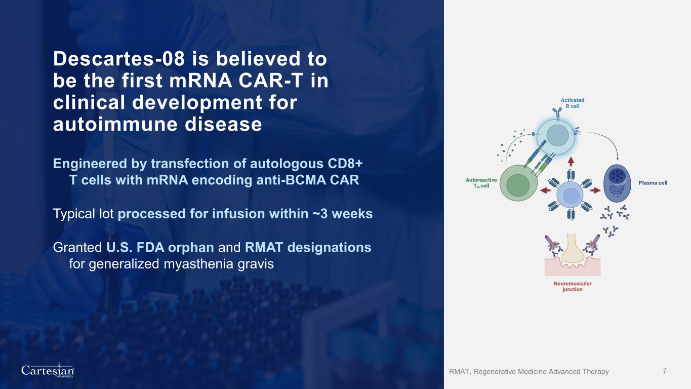 Wholly-owned pipeline targets autoimmune disease * IND for pediatric basket trial expected by year-end 2024, includes juvenile SLE, juvenile MG and other conditions ** Phase 1 dose escalation trial in myeloma underway, first patient dosing expected by year-end Asset Indications Discovery/Preclinical Phase 1 Phase 2 Pivotal Descartes-08 Autologous mRNA CAR-T Myasthenia Gravis (MG) Systemic Lupus Erythematosus (SLE) Pediatric Autoimmune Diseases* Descartes-15 Autologous mRNA CAR-T Autoimmune Diseases** 6