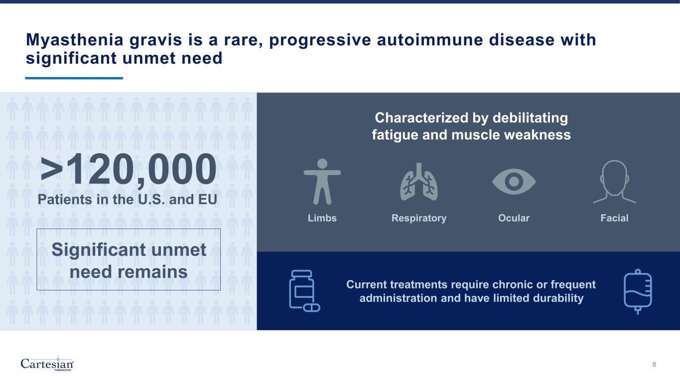 ® THERAPEUTICS 7 Descartes-08 is believed to be the first mRNA CAR-T in clinical development for autoimmune disease Engineered by transfection of autologous CD8+ T cells with mRNA encoding anti-BCMA CAR Typical lot processed for infusion within ~3 weeks Granted U.S. FDA orphan and RMAT designations for generalized myasthenia gravis RMAT, Regenerative Medicine Advanced Therapy
