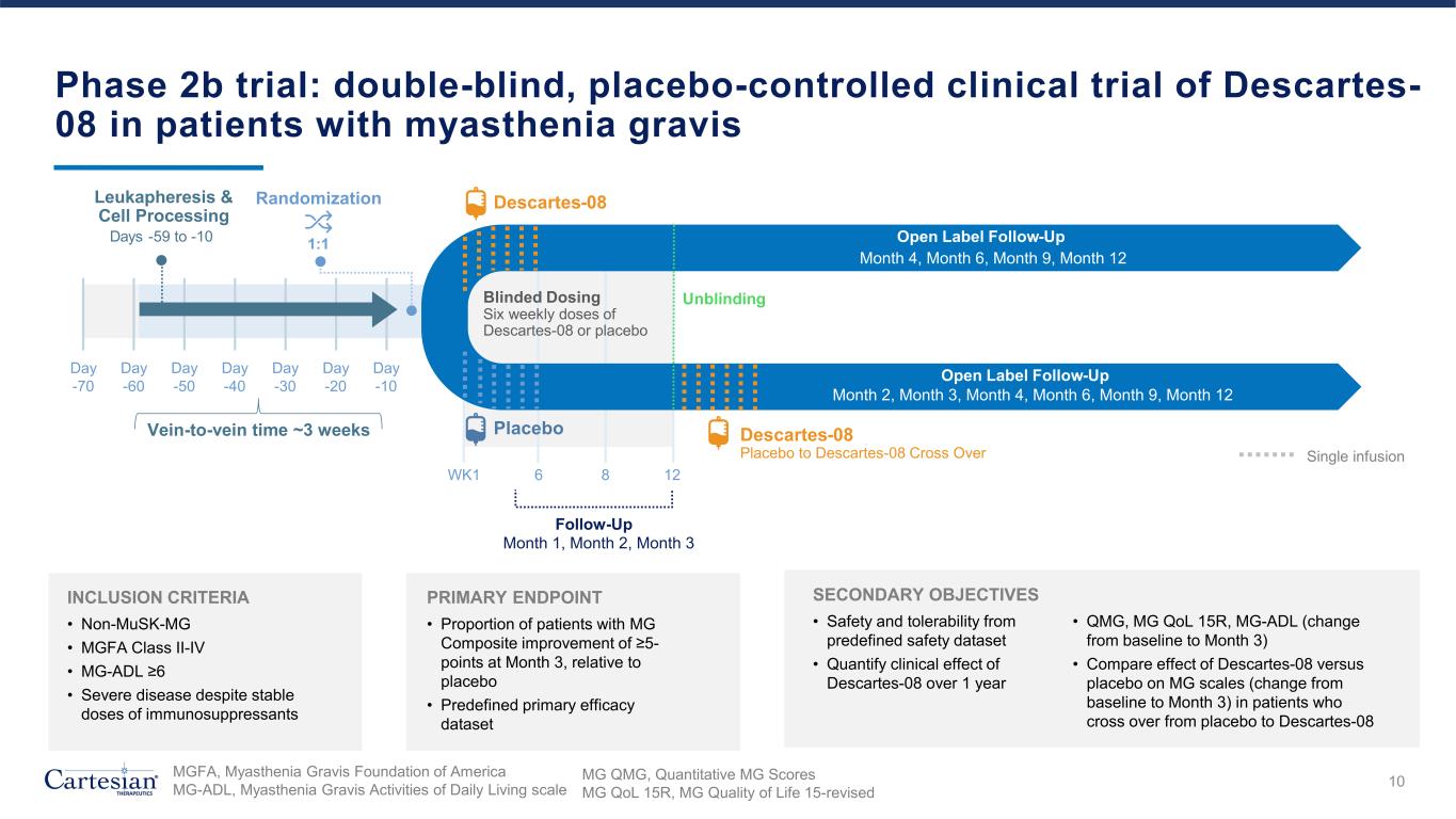 ® THERAPEUTICS Met primary endpoint • 71% response rate at Month 3 for Descartes-08 patients vs. 25% for placebo (p<0.05) Deep, durable responses observed in patients treated with Descartes-08 Safety profile continues to support outpatient administration Data support advancement to Phase 3 9 Descartes-08 in MG Phase 2b Topline Results • Responders observed to have ~3x greater improvements than clinically meaningful* • Deep, durable responses and favorable safety profile observed in highly symptomatic, heavily pre-treated patients with MG • Novel design: randomized double-blind placebo- controlled trial of engineered cell therapy in autoimmunity *Clinically meaningful response: three-point reduction in MG Composite score from baseline