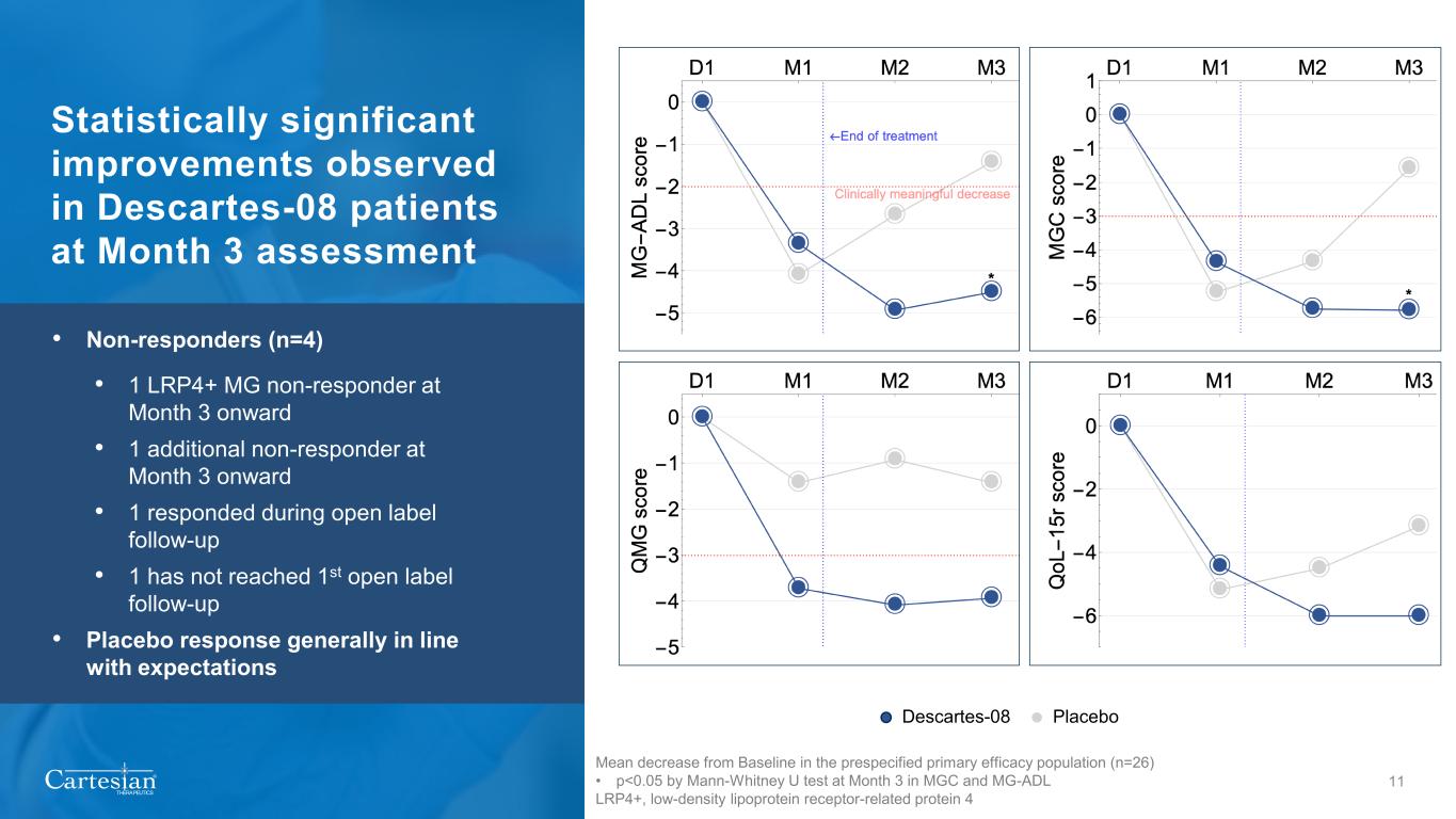 Day -70 Day -60 Day -50 Day -40 Day -30 Day -20 Day -10 Phase 2b trial: double-blind, placebo-controlled clinical trial of Descartes- 08 in patients with myasthenia gravis Leukapheresis & Cell Processing Days -59 to -10 Randomization WK1 6 8 12 Blinded Dosing Six weekly doses of Descartes-08 or placebo Follow-Up Month 1, Month 2, Month 3 Descartes-08 Open Label Follow-Up Month 4, Month 6, Month 9, Month 12 10 1:1 Placebo MGFA, Myasthenia Gravis Foundation of America MG-ADL, Myasthenia Gravis Activities of Daily Living scale MG QMG, Quantitative MG Scores MG QoL 15R, MG Quality of Life 15-revised Unblinding Open Label Follow-Up Month 2, Month 3, Month 4, Month 6, Month 9, Month 12 Descartes-08 Placebo to Descartes-08 Cross Over INCLUSION CRITERIA • Non-MuSK-MG • MGFA Class II-IV • MG-ADL ≥6 • Severe disease despite stable doses of immunosuppressants PRIMARY ENDPOINT • Proportion of patients with MG Composite improvement of ≥5- points at Month 3, relative to placebo • Predefined primary efficacy dataset SECONDARY OBJECTIVES • Safety and tolerability from predefined safety dataset • Quantify clinical effect of Descartes-08 over 1 year • QMG, MG QoL 15R, MG-ADL (change from baseline to Month 3) • Compare effect of Descartes-08 versus placebo on MG scales (change from baseline to Month 3) in patients who cross over from placebo to Descartes-08 Single infusion Vein-to-vein time ~3 weeks