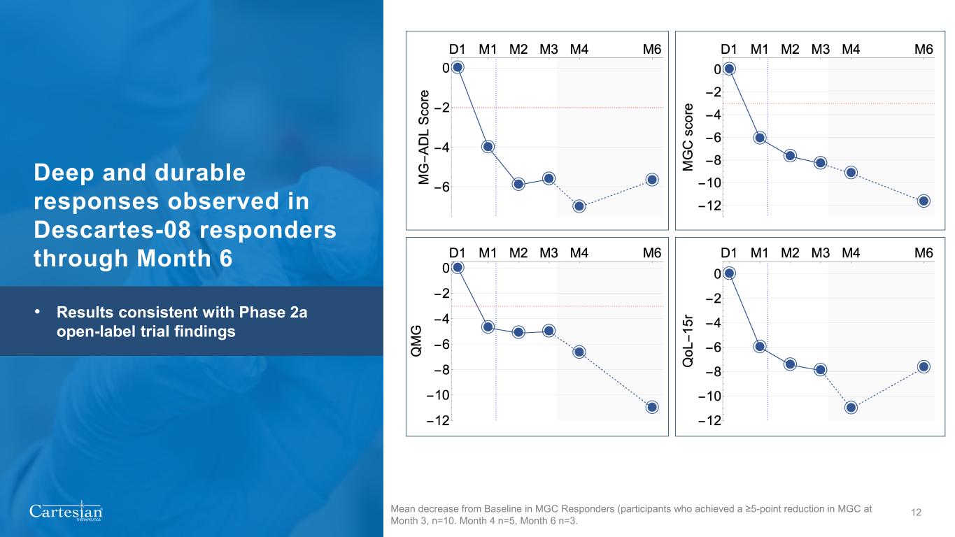 ® THERAPEUTICS 11 Mean decrease from Baseline in the prespecified primary efficacy population (n=26) • p<0.05 by Mann-Whitney U test at Month 3 in MGC and MG-ADL LRP4+, low-density lipoprotein receptor-related protein 4 Statistically significant improvements observed in Descartes-08 patients at Month 3 assessment • Non-responders (n=4) • 1 LRP4+ MG non-responder at Month 3 onward • 1 additional non-responder at Month 3 onward • 1 responded during open label follow-up • 1 has not reached 1st open label follow-up • Placebo response generally in line with expectations Descartes-08 Placebo