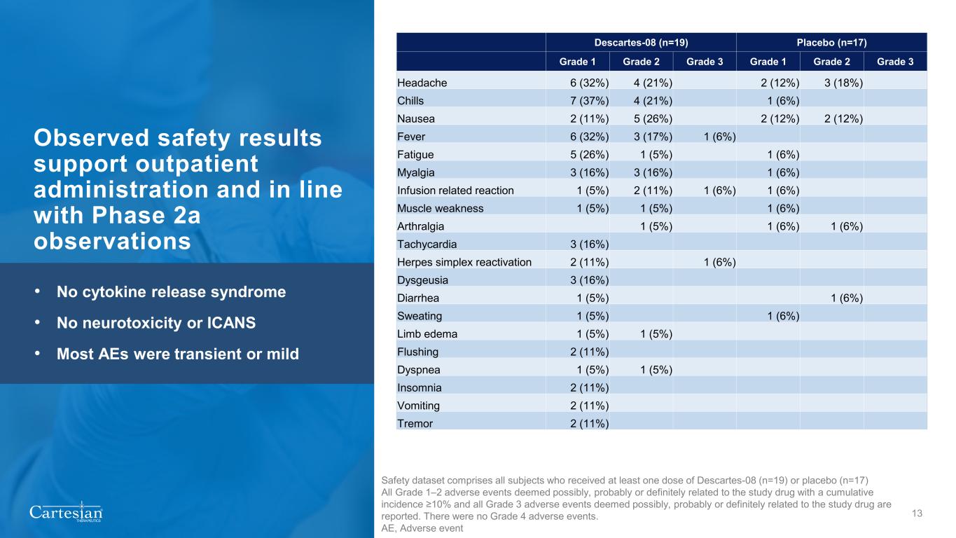 ® THERAPEUTICS 12Mean decrease from Baseline in MGC Responders (participants who achieved a ≥5-point reduction in MGC at Month 3, n=10. Month 4 n=5, Month 6 n=3. Deep and durable responses observed in Descartes-08 responders through Month 6 • Results consistent with Phase 2a open-label trial findings