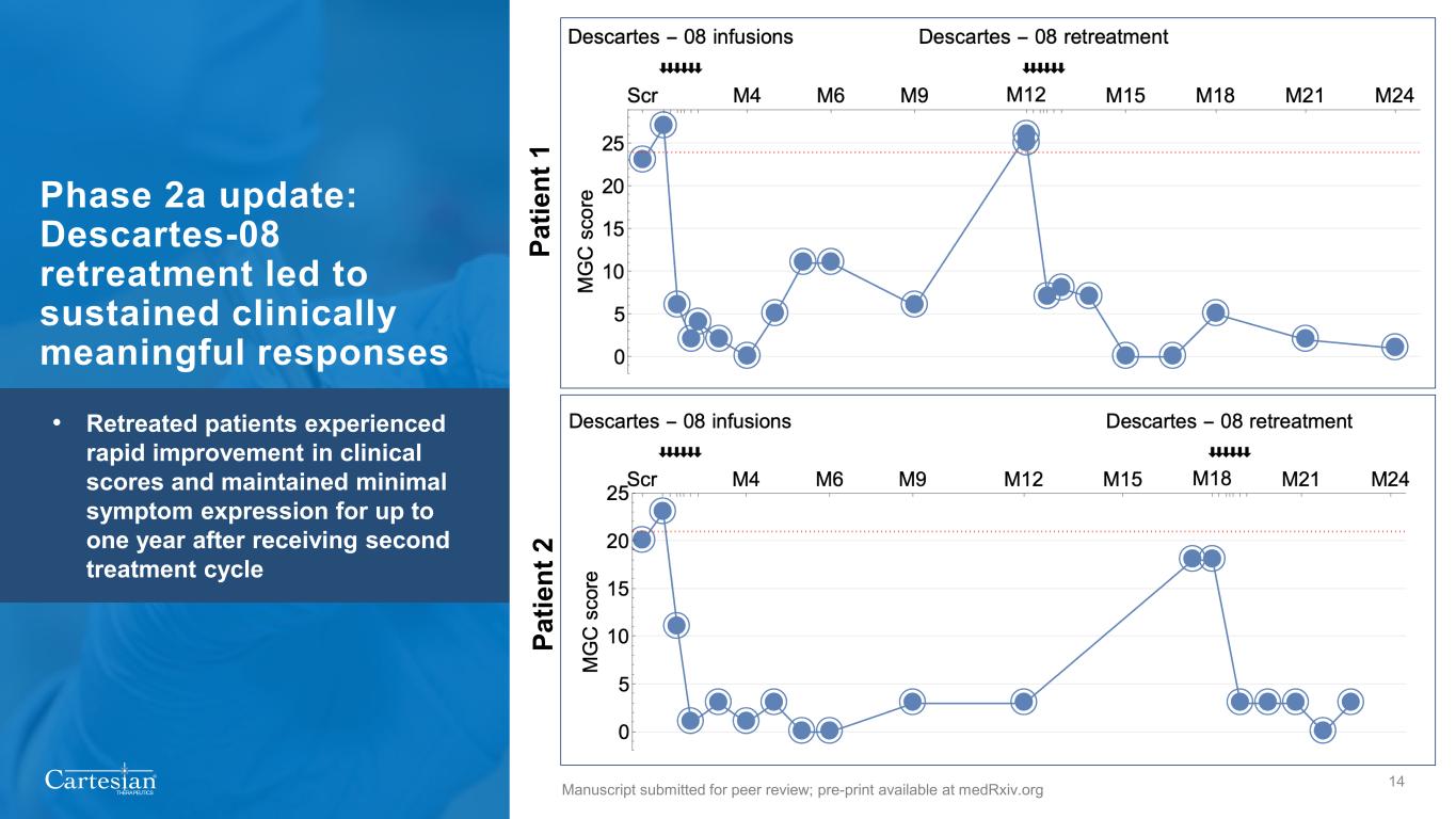 ® THERAPEUTICS Observed safety results support outpatient administration and in line with Phase 2a observations 13 Descartes-08 (n=19) Placebo (n=17) Grade 1 Grade 2 Grade 3 Grade 1 Grade 2 Grade 3 Headache 6 (32%) 4 (21%) 2 (12%) 3 (18%) Chills 7 (37%) 4 (21%) 1 (6%) Nausea 2 (11%) 5 (26%) 2 (12%) 2 (12%) Fever 6 (32%) 3 (17%) 1 (6%) Fatigue 5 (26%) 1 (5%) 1 (6%) Myalgia 3 (16%) 3 (16%) 1 (6%) Infusion related reaction 1 (5%) 2 (11%) 1 (6%) 1 (6%) Muscle weakness 1 (5%) 1 (5%) 1 (6%) Arthralgia 1 (5%) 1 (6%) 1 (6%) Tachycardia 3 (16%) Herpes simplex reactivation 2 (11%) 1 (6%) Dysgeusia 3 (16%) Diarrhea 1 (5%) 1 (6%) Sweating 1 (5%) 1 (6%) Limb edema 1 (5%) 1 (5%) Flushing 2 (11%) Dyspnea 1 (5%) 1 (5%) Insomnia 2 (11%) Vomiting 2 (11%) Tremor 2 (11%) Safety dataset comprises all subjects who received at least one dose of Descartes-08 (n=19) or placebo (n=17) All Grade 1–2 adverse events deemed possibly, probably or definitely related to the study drug with a cumulative incidence ≥10% and all Grade 3 adverse events deemed possibly, probably or definitely related to the study drug are reported. There were no Grade 4 adverse events. AE, Adverse event • No cytokine release syndrome • No neurotoxicity or ICANS • Most AEs were transient or mild