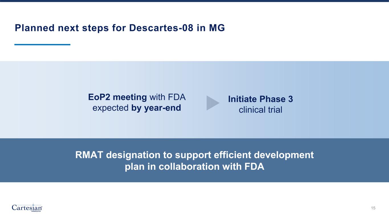 Planned next steps for Descartes-08 in MG 15 EoP2 meeting with FDA expected by year-end Initiate Phase 3 clinical trial RMAT designation to support efficient development plan in collaboration with FDA