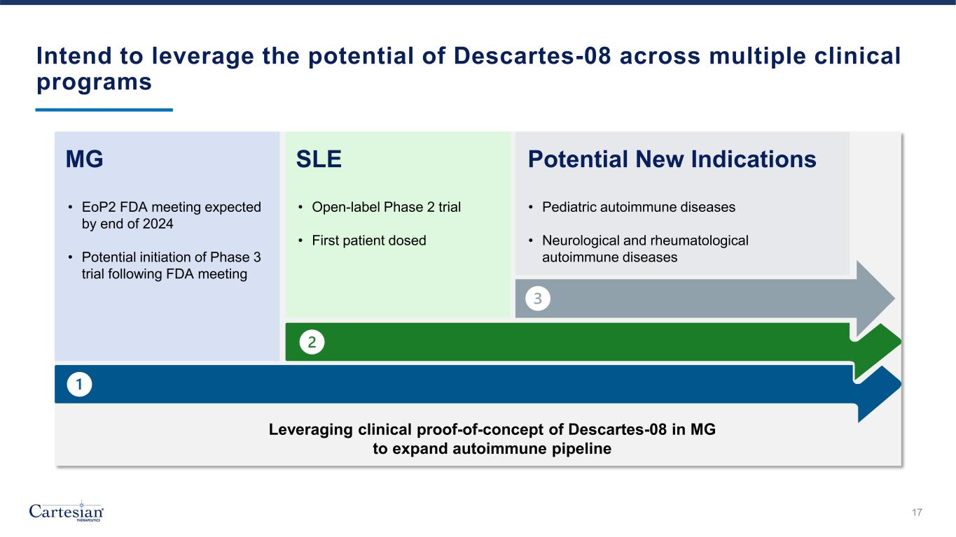Exploring potential of Descartes-08 in Systemic Lupus Erythematosus (SLE) 16 • Open-label trial in up to 30 adults with moderate to severe multi-refractory SLE and no CNS involvement • Designed to assess safety, tolerability, and manufacturing feasibility of Descartes-08 in patients with SLE • Secondary objectives include standard measures of clinical activity in SLE: • Systemic Lupus Erythematosus Disease Activity Index 2000 (SLEDAI-2K) • Physician Global Assessment (PGA) • Systemic Lupus Erythematosus Responder Index (SRI) • British Isles Lupus Assessment Group (BILAG)–based Composite Lupus Assessment (BICLA) Screening (Days -60 to -15) Leukapheresis & Cell Processing (Days -59 to -14) ~3 Weeks Vein-to-Vein Time Descartes-08 (Day 1, 8, 15, 22, 29, 36) Safety/Response Assessment (Day 50) Follow up visits (Months 3, 6, 9, 12) IND CLEARED, FIRST PATIENT DOSED IN 1H 2024 PHASE 2 TRIAL ONGOING IND, Investigational New Drug Application