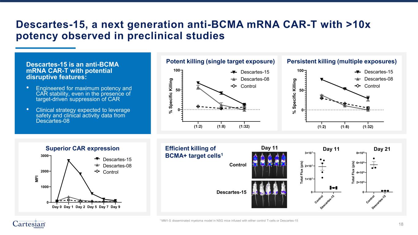 Descartes-15, a next generation anti-BCMA mRNA CAR-T with >10x potency observed in preclinical studies Potent killing (single target exposure) Persistent killing (multiple exposures) (1:2) (1:8) (1:32) 0 50 100 % S pe ci fic K ill in g DC-15 DC-08 Vehicle EP escartes-08 escartes-15 Control (1:2) (1:8) (1:32) 0 50 100 % S pe ci fic K ill in g DC-15 DC-08 Vehicle EP escartes-08 escartes-15 Control Descartes-15 is an anti-BCMA mRNA CAR-T with potential disruptive features: • Engineered for maximum potency and CAR stability, even in the presence of target-driven suppression of CAR • Clinical strategy expected to leverage safety and clinical activity data from Descartes-08 Day 0 Day 1 Day 2 Day 5 Day 7 Day 9 0 1000 2000 3000 M FI DC-15 DC-08 Vehicle EP escartes-08 escartes-15 Control Superior CAR expression Contro l Des ca rte s-1 5 0 2×108 4×108 6×108 8×108 Day 21 To ta l F lu x (p /s ) Control Descartes-15 Contro l Des ca rte s-1 5 0 1×107 2×107 3×107 Day 11 To ta l F lu x (p /s ) Day 21Day 11Efficient killing of BCMA+ target cells1 Day 11 1 MM1-S disseminated myeloma model in NSG mice infused with either control T-cells or Descartes-15 18