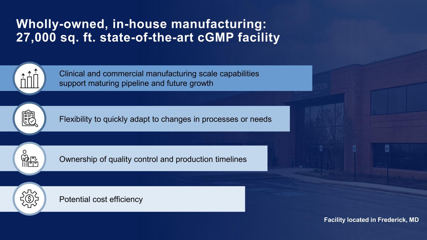 Wholly-owned, in-house manufacturing: 27,000 sq. ft. state-of-the-art cGMP facility Ownership of quality control and production timelines Flexibility to quickly adapt to changes in processes or needs Potential cost efficiency Clinical and commercial manufacturing scale capabilities support maturing pipeline and future growth Facility located in Frederick, MD