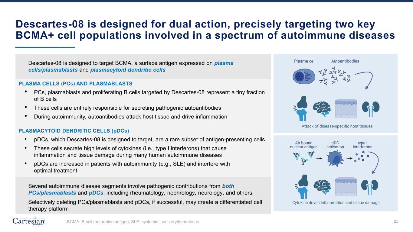 Descartes-08 is designed for dual action, precisely targeting two key BCMA+ cell populations involved in a spectrum of autoimmune diseases 25 Several autoimmune disease segments involve pathogenic contributions from both PCs/plasmablasts and pDCs, including rheumatology, nephrology, neurology, and others Selectively deleting PCs/plasmablasts and pDCs, if successful, may create a differentiated cell therapy platform PLASMA CELLS (PCs) AND PLASMABLASTS • PCs, plasmablasts and proliferating B cells targeted by Descartes-08 represent a tiny fraction of B cells • These cells are entirely responsible for secreting pathogenic autoantibodies • During autoimmunity, autoantibodies attack host tissue and drive inflammation PLASMACYTOID DENDRITIC CELLS (pDCs) • pDCs, which Descartes-08 is designed to target, are a rare subset of antigen-presenting cells • These cells secrete high levels of cytokines (i.e., type I interferons) that cause inflammation and tissue damage during many human autoimmune diseases • pDCs are increased in patients with autoimmunity (e.g., SLE) and interfere with optimal treatment • Descartes-08 is designed to target BCMA, a surface antigen expressed on plasma cells/plasmablasts and plasmacytoid dendritic cells BCMA: B cell maturation antigen; SLE: systemic lupus erythematosus
