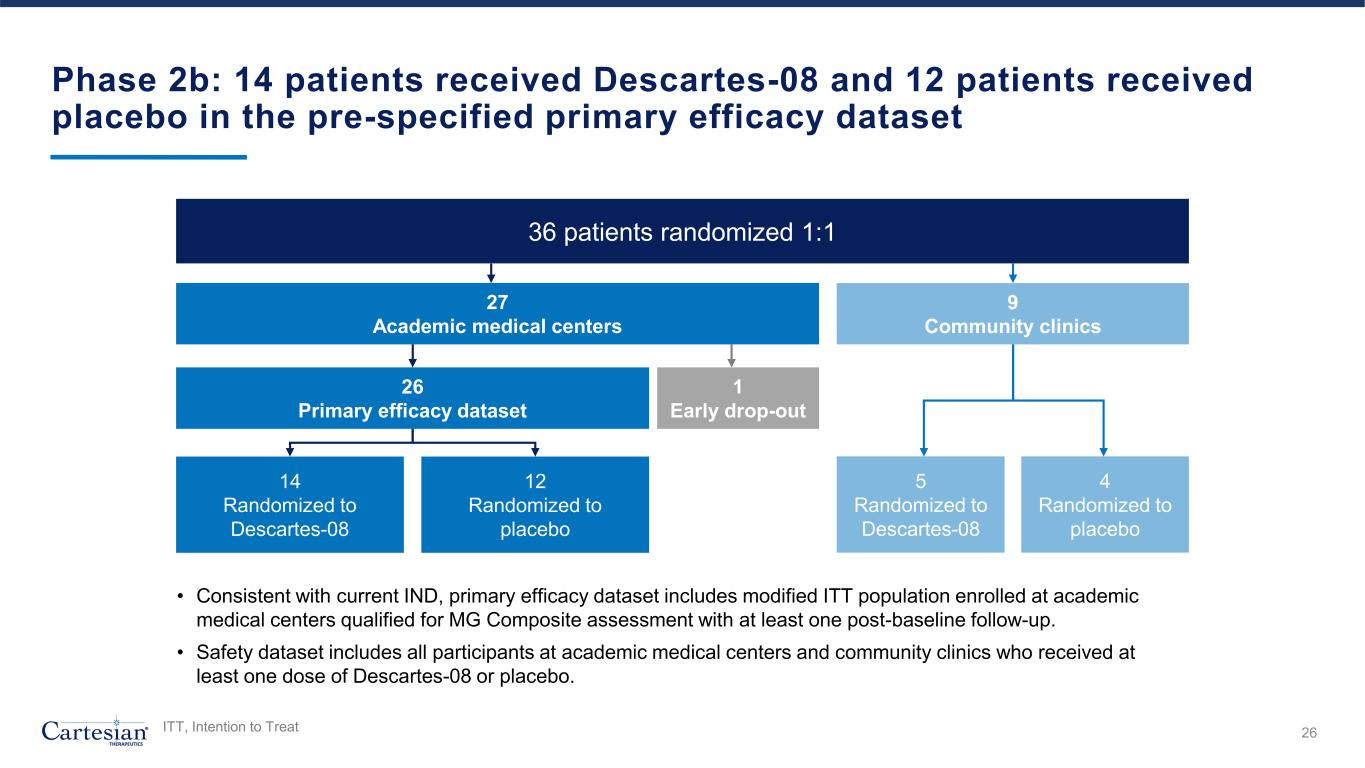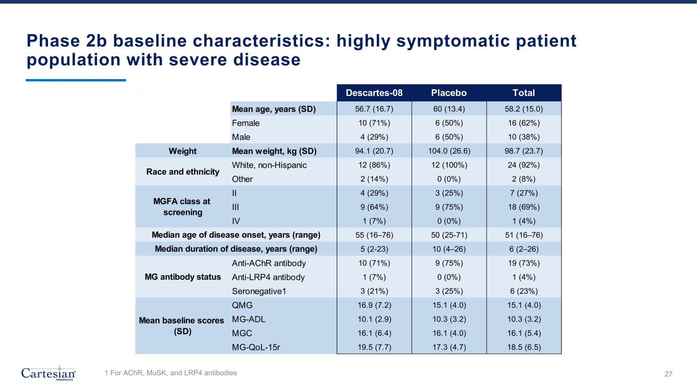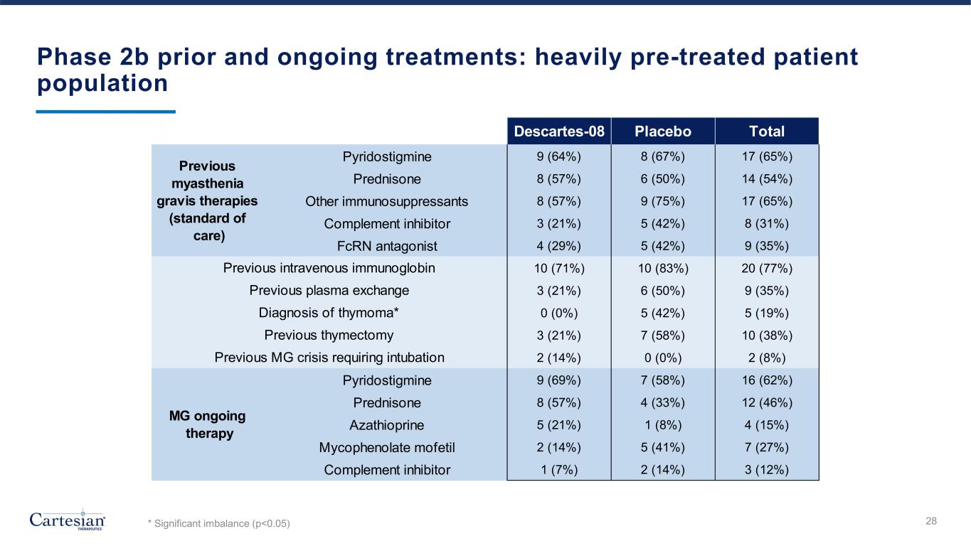 Phase 2b: 14 patients received Descartes-08 and 12 patients received placebo in the pre-specified primary efficacy dataset 27 Academic medical centers 9 Community clinics 1 Early drop-out 26 Primary efficacy dataset 14 Randomized to Descartes-08 12 Randomized to placebo 5 Randomized to Descartes-08 4 Randomized to placebo • Consistent with current IND, primary efficacy dataset includes modified ITT population enrolled at academic medical centers qualified for MG Composite assessment with at least one post-baseline follow-up. • Safety dataset includes all participants at academic medical centers and community clinics who received at least one dose of Descartes-08 or placebo. 26 36 patients randomized 1:1 ITT, Intention to Treat