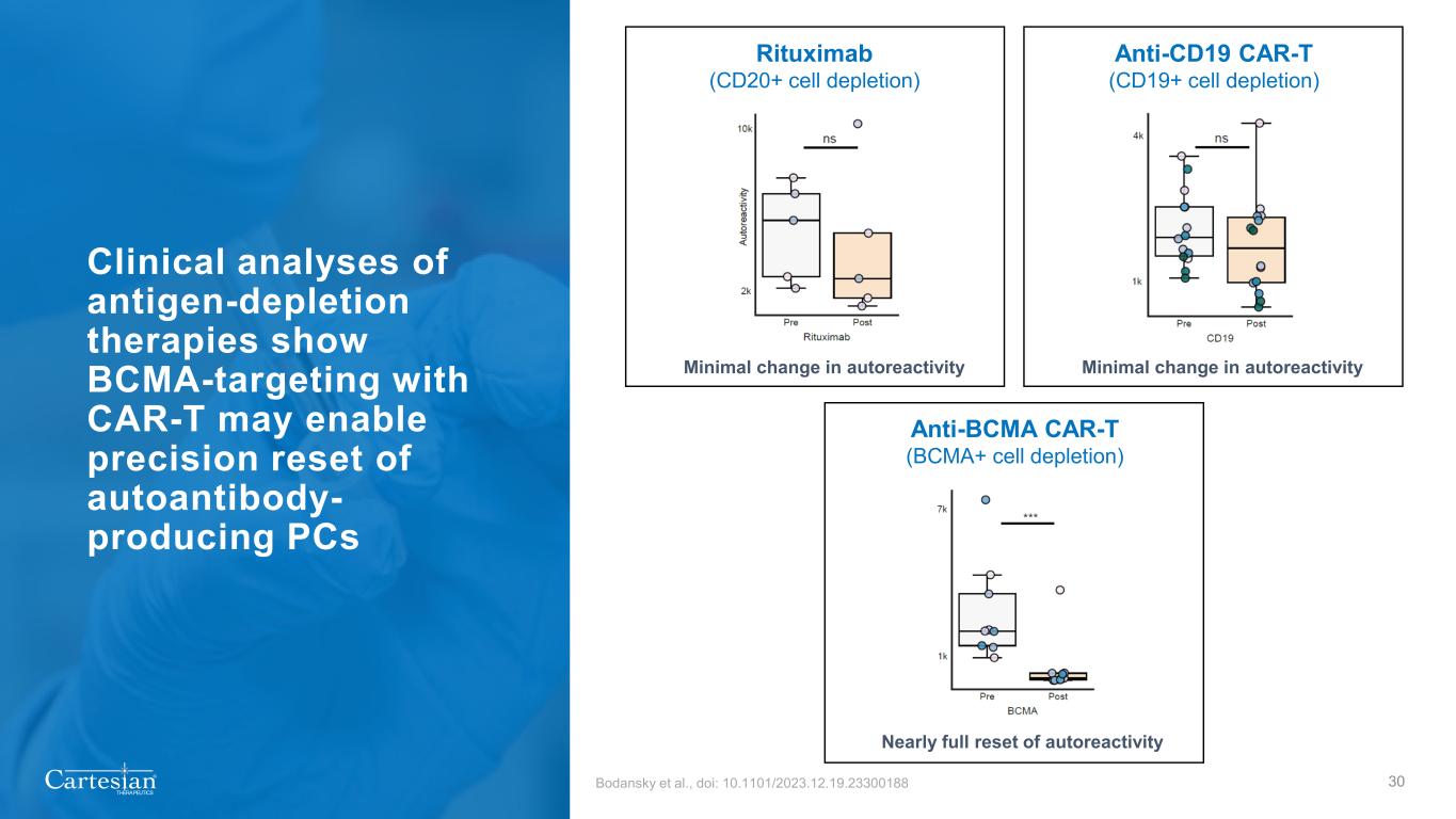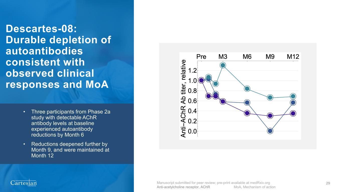 ® THERAPEUTICS 29 Descartes-08: Durable depletion of autoantibodies consistent with observed clinical responses and MoA • Three participants from Phase 2a study with detectable AChR antibody levels at baseline experienced autoantibody reductions by Month 6 • Reductions deepened further by Month 9, and were maintained at Month 12 Manuscript submitted for peer review; pre-print available at medRxiv.org Anti-acetylcholine receptor, AChR MoA, Mechanism of action