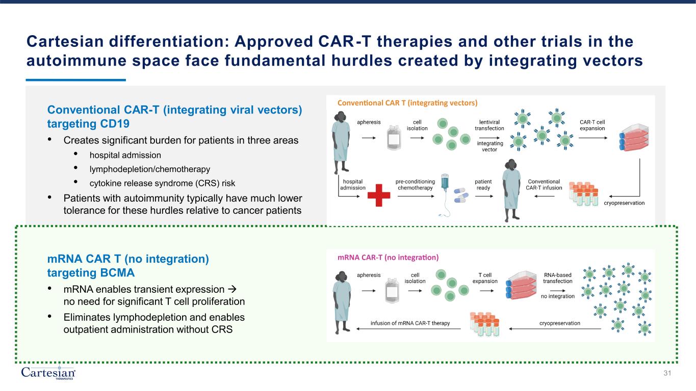 Cartesian differentiation: Approved CAR-T therapies and other trials in the autoimmune space face fundamental hurdles created by integrating vectors 31 Conventional CAR-T (integrating viral vectors) targeting CD19 • Creates significant burden for patients in three areas • hospital admission • lymphodepletion/chemotherapy • cytokine release syndrome (CRS) risk • Patients with autoimmunity typically have much lower tolerance for these hurdles relative to cancer patients mRNA CAR T (no integration) targeting BCMA • mRNA enables transient expression  no need for significant T cell proliferation • Eliminates lymphodepletion and enables outpatient administration without CRS