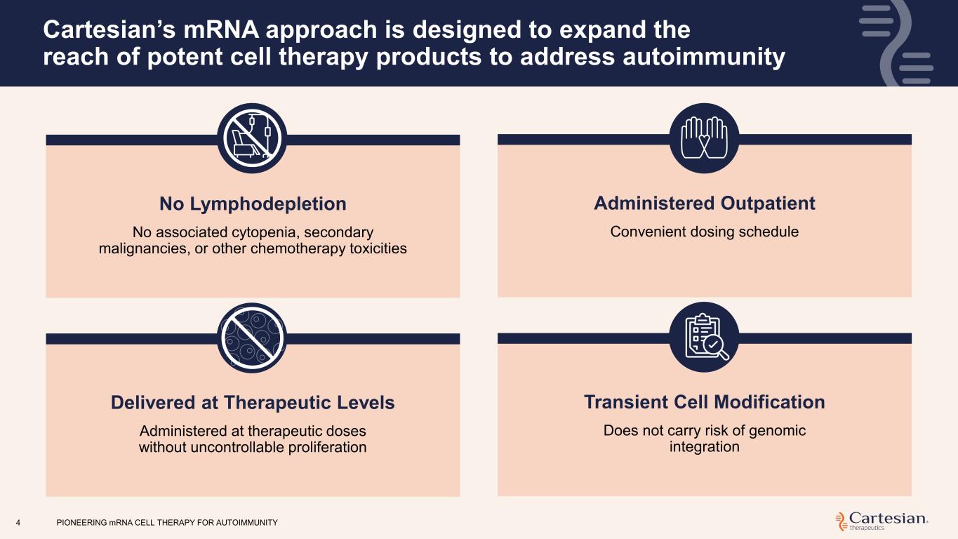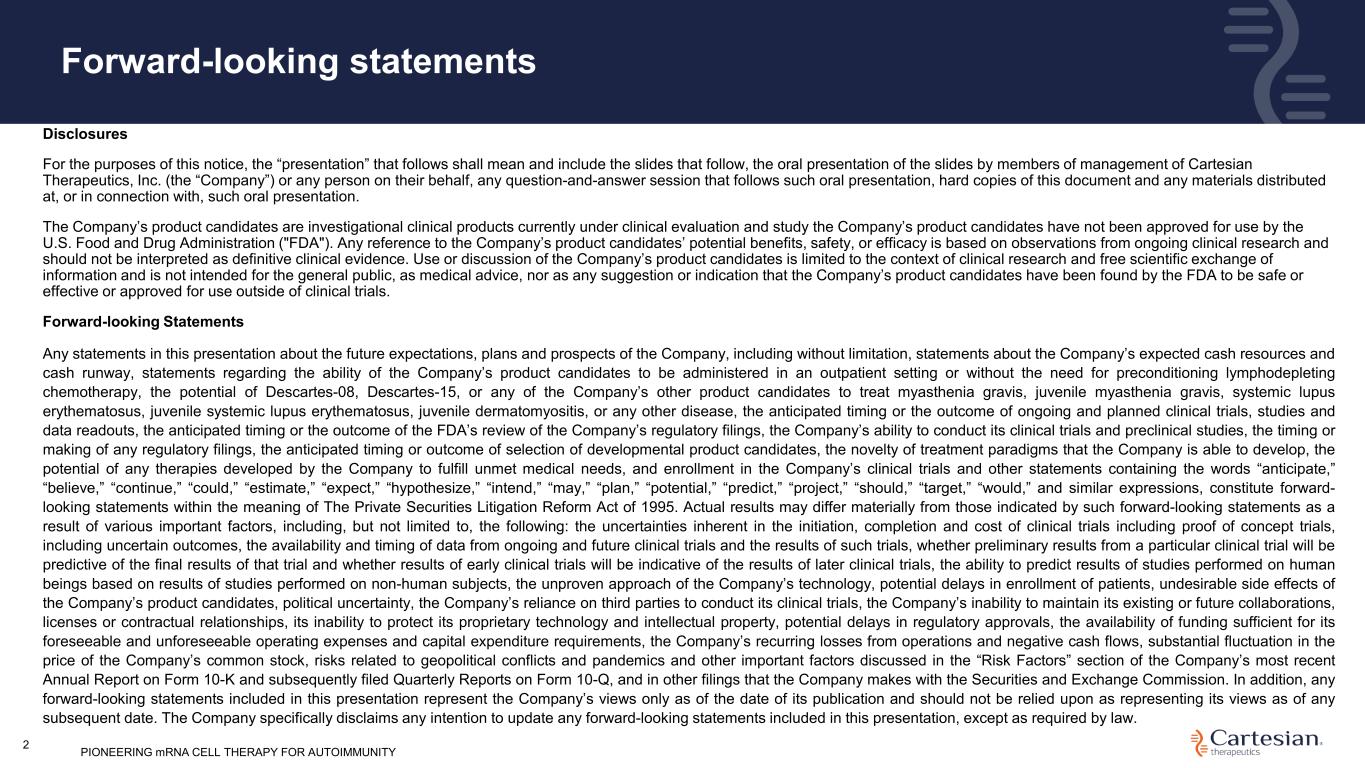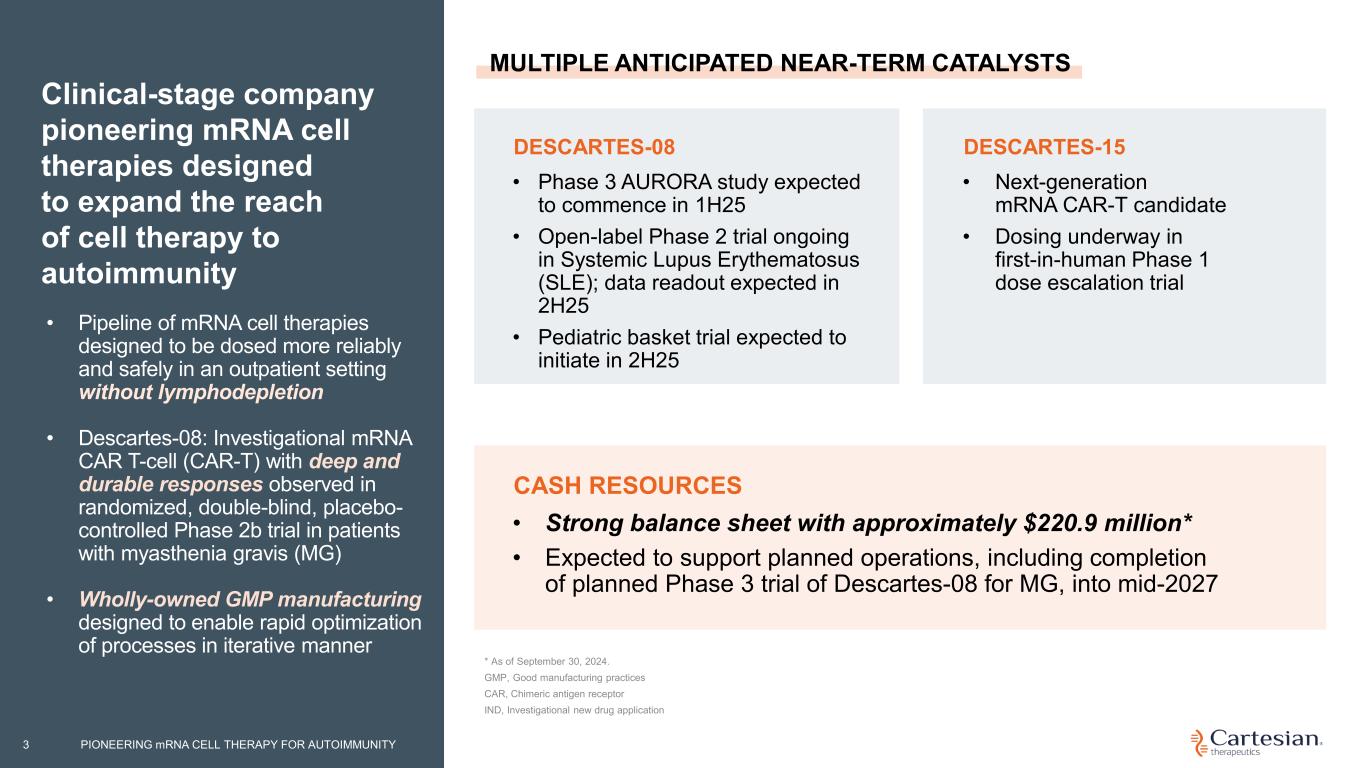 Disclosures For the purposes of this notice, the “presentation” that follows shall mean and include the slides that follow, the oral presentation of the slides by members of management of Cartesian Therapeutics, Inc. (the “Company”) or any person on their behalf, any question-and-answer session that follows such oral presentation, hard copies of this document and any materials distributed at, or in connection with, such oral presentation. The Company’s product candidates are investigational clinical products currently under clinical evaluation and study the Company’s product candidates have not been approved for use by the U.S. Food and Drug Administration ("FDA"). Any reference to the Company’s product candidates’ potential benefits, safety, or efficacy is based on observations from ongoing clinical research and should not be interpreted as definitive clinical evidence. Use or discussion of the Company’s product candidates is limited to the context of clinical research and free scientific exchange of information and is not intended for the general public, as medical advice, nor as any suggestion or indication that the Company’s product candidates have been found by the FDA to be safe or effective or approved for use outside of clinical trials. Forward-looking Statements Any statements in this presentation about the future expectations, plans and prospects of the Company, including without limitation, statements about the Company’s expected cash resources and cash runway, statements regarding the ability of the Company’s product candidates to be administered in an outpatient setting or without the need for preconditioning lymphodepleting chemotherapy, the potential of Descartes-08, Descartes-15, or any of the Company’s other product candidates to treat myasthenia gravis, juvenile myasthenia gravis, systemic lupus erythematosus, juvenile systemic lupus erythematosus, juvenile dermatomyositis, or any other disease, the anticipated timing or the outcome of ongoing and planned clinical trials, studies and data readouts, the anticipated timing or the outcome of the FDA’s review of the Company’s regulatory filings, the Company’s ability to conduct its clinical trials and preclinical studies, the timing or making of any regulatory filings, the anticipated timing or outcome of selection of developmental product candidates, the novelty of treatment paradigms that the Company is able to develop, the potential of any therapies developed by the Company to fulfill unmet medical needs, and enrollment in the Company’s clinical trials and other statements containing the words “anticipate,” “believe,” “continue,” “could,” “estimate,” “expect,” “hypothesize,” “intend,” “may,” “plan,” “potential,” “predict,” “project,” “should,” “target,” “would,” and similar expressions, constitute forward- looking statements within the meaning of The Private Securities Litigation Reform Act of 1995. Actual results may differ materially from those indicated by such forward-looking statements as a result of various important factors, including, but not limited to, the following: the uncertainties inherent in the initiation, completion and cost of clinical trials including proof of concept trials, including uncertain outcomes, the availability and timing of data from ongoing and future clinical trials and the results of such trials, whether preliminary results from a particular clinical trial will be predictive of the final results of that trial and whether results of early clinical trials will be indicative of the results of later clinical trials, the ability to predict results of studies performed on human beings based on results of studies performed on non-human subjects, the unproven approach of the Company’s technology, potential delays in enrollment of patients, undesirable side effects of the Company’s product candidates, political uncertainty, the Company’s reliance on third parties to conduct its clinical trials, the Company’s inability to maintain its existing or future collaborations, licenses or contractual relationships, its inability to protect its proprietary technology and intellectual property, potential delays in regulatory approvals, the availability of funding sufficient for its foreseeable and unforeseeable operating expenses and capital expenditure requirements, the Company’s recurring losses from operations and negative cash flows, substantial fluctuation in the price of the Company’s common stock, risks related to geopolitical conflicts and pandemics and other important factors discussed in the “Risk Factors” section of the Company’s most recent Annual Report on Form 10-K and subsequently filed Quarterly Reports on Form 10-Q, and in other filings that the Company makes with the Securities and Exchange Commission. In addition, any forward-looking statements included in this presentation represent the Company’s views only as of the date of its publication and should not be relied upon as representing its views as of any subsequent date. The Company specifically disclaims any intention to update any forward-looking statements included in this presentation, except as required by law. Forward-looking statements PIONEERING mRNA CELL THERAPY FOR AUTOIMMUNITY2