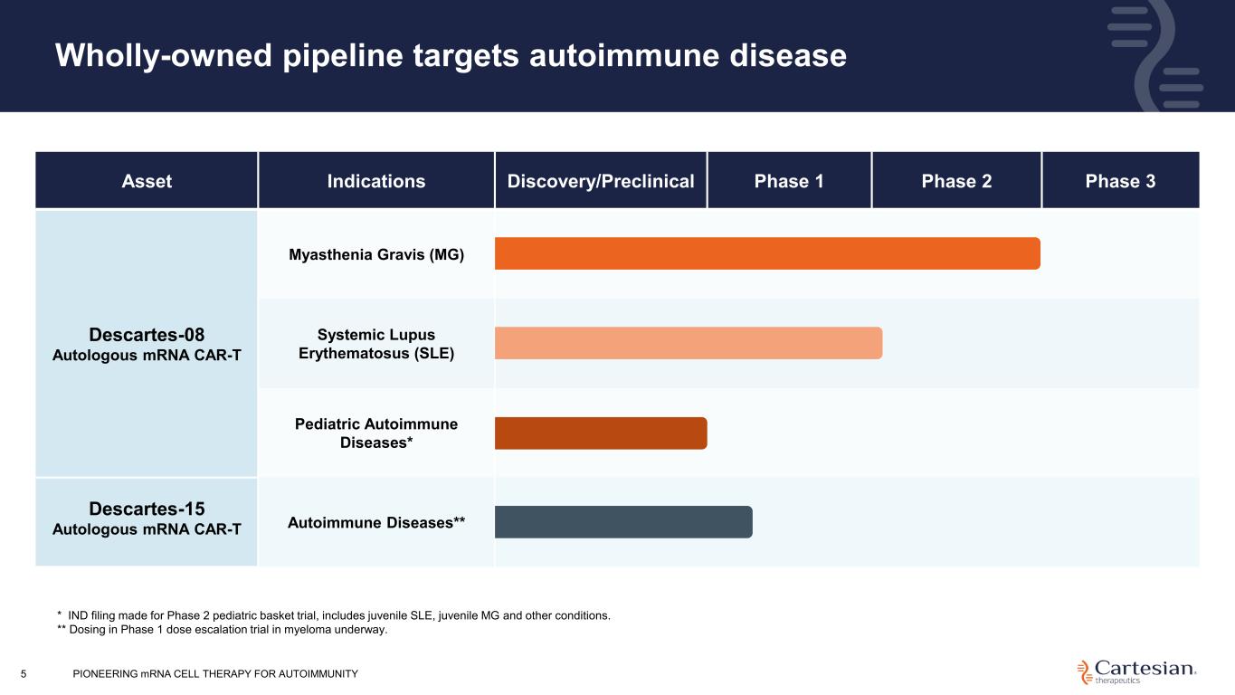 PIONEERING mRNA CELL THERAPY FOR AUTOIMMUNITY4 Cartesian’s mRNA approach is designed to expand the reach of potent cell therapy products to address autoimmunity No Lymphodepletion No associated cytopenia, secondary malignancies, or other chemotherapy toxicities Administered Outpatient Convenient dosing schedule Delivered at Therapeutic Levels Administered at therapeutic doses without uncontrollable proliferation Transient Cell Modification Does not carry risk of genomic integration