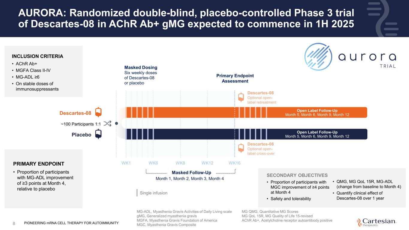 Deep and durable responses maintained over 12 months in participants treated with Descartes-08 in Phase 2b PIONEERING mRNA CELL THERAPY FOR AUTOIMMUNITY7 Deepening responses observed over time Durable responses observed over time Deepest responses observed in participants without exposure to prior biologic therapy Safety profile continues to support outpatient administration Planned Phase 3 AURORA study design finalized following meeting with U.S. FDA • Primary endpoint to assess MG-ADL improvement of ≥3 points at Month 4 relative to placebo • Expected to commence in 1H25