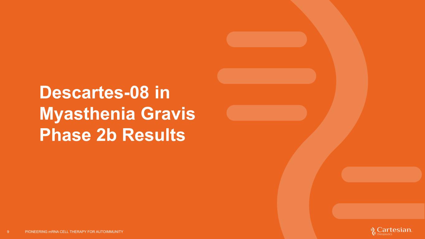 8 AURORA: Randomized double-blind, placebo-controlled Phase 3 trial of Descartes-08 in AChR Ab+ gMG expected to commence in 1H 2025 WK1 Masked Dosing Six weekly doses of Descartes-08 or placebo PRIMARY ENDPOINT • Proportion of participants with MG-ADL improvement of ≥3 points at Month 4, relative to placebo SECONDARY OBJECTIVES • Proportion of participants with MGC improvement of ≥4 points at Month 4 • Safety and tolerability • QMG, MG QoL 15R, MG-ADL (change from baseline to Month 4) • Quantify clinical effect of Descartes-08 over 1 year PIONEERING mRNA CELL THERAPY FOR AUTOIMMUNITY WK6 WK8 WK12 WK16 Masked Follow-Up Month 1, Month 2, Month 3, Month 4 Primary Endpoint Assessment Descartes-08 Optional open- label retreatment Descartes-08 Optional open- label cross-over Open Label Follow-Up Month 5, Month 6, Month 9, Month 12 Open Label Follow-Up Month 5, Month 6, Month 9, Month 12Descartes-08 Placebo ~100 Participants 1:1 INCLUSION CRITERIA • AChR Ab+ • MGFA Class II-IV • MG-ADL ≥6 • On stable doses of immunosuppressants Single infusion MG-ADL, Myasthenia Gravis Activities of Daily Living scale gMG, Generalized myasthenia gravis MGFA, Myasthenia Gravis Foundation of America MGC, Myasthenia Gravis Composite MG QMG, Quantitative MG Scores MG QoL 15R, MG Quality of Life 15-revised AChR Ab+, Acetylcholine receptor autoantibody positive