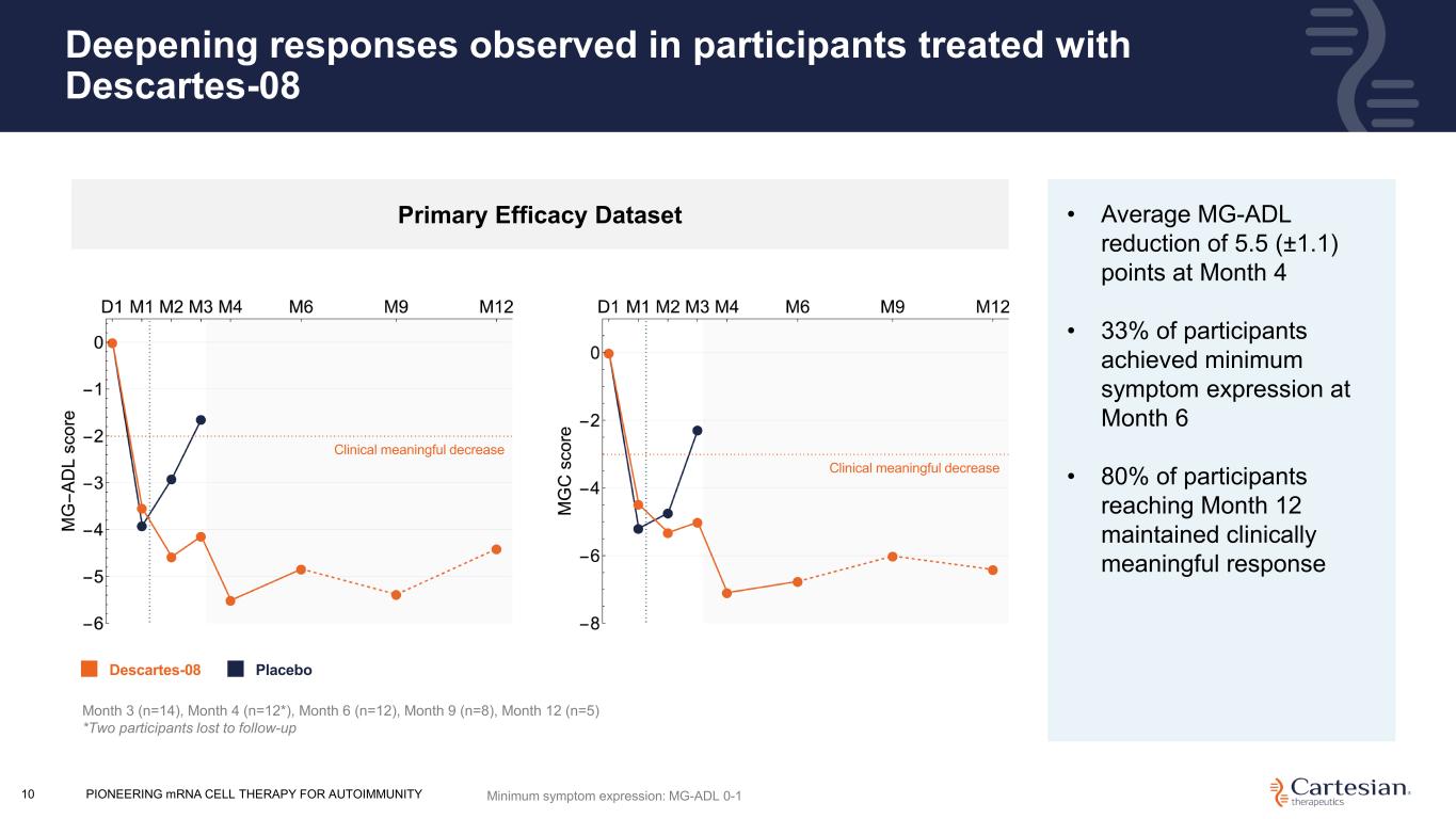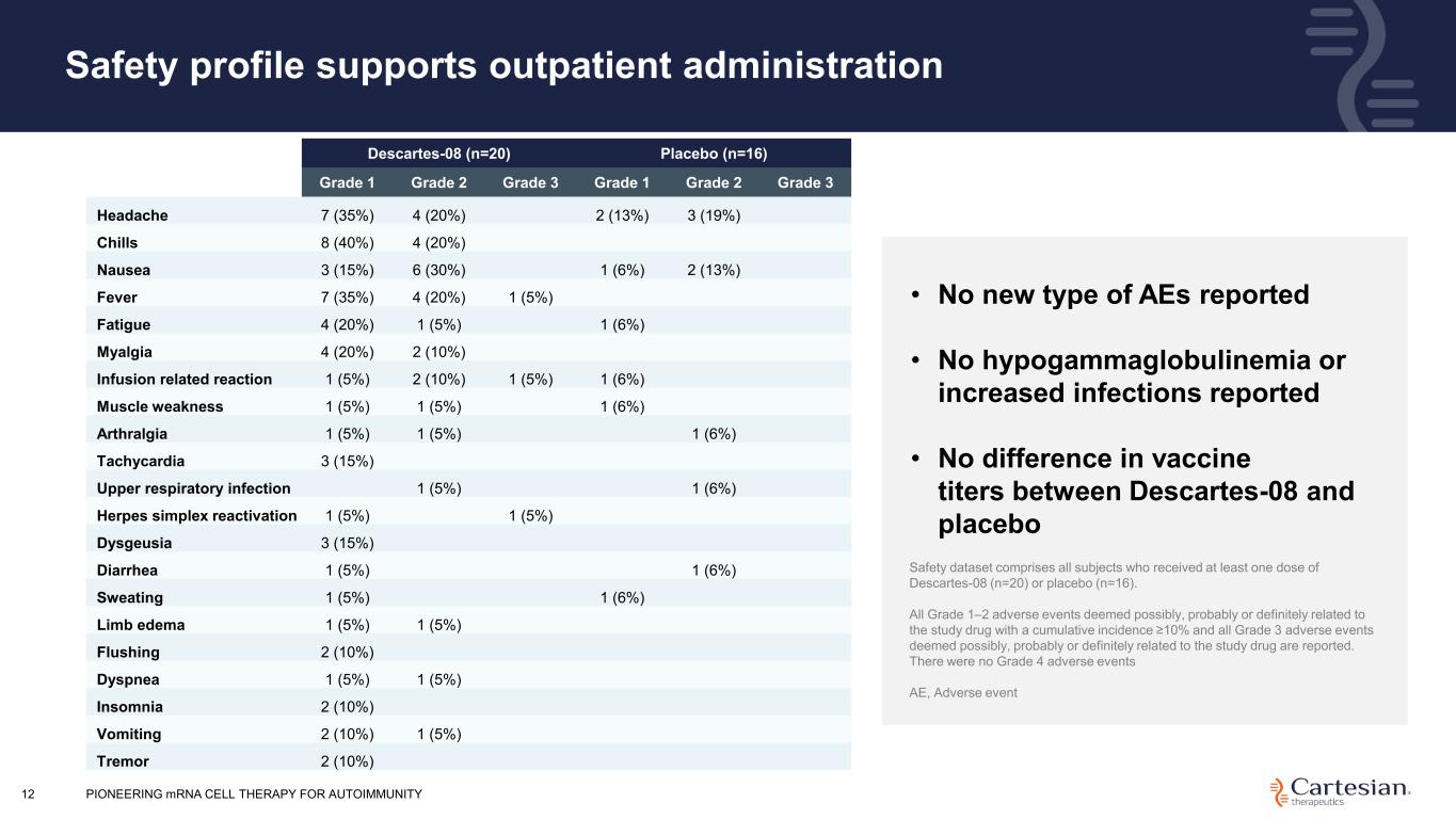 Deepest responses observed in participants with no prior exposure to complement or FcRn inhibitors PIONEERING mRNA CELL THERAPY FOR AUTOIMMUNITY11 • Average MG-ADL reduction of 6.6 (±1.5) points at Month 4 • 57% of participants achieved minimum symptom expression at Month 6 • 100% of participants reaching Month 12 maintained clinically meaningful response Primary Efficacy Dataset (No Prior Biologics) Month 3 (n=9), Month 4 (n=7*), Month 6 (n=7), Month 9 (n=4), Month 12 (n=2) *Two participants lost to follow-up Descartes-08 Clinical meaningful decrease Clinical meaningful decrease