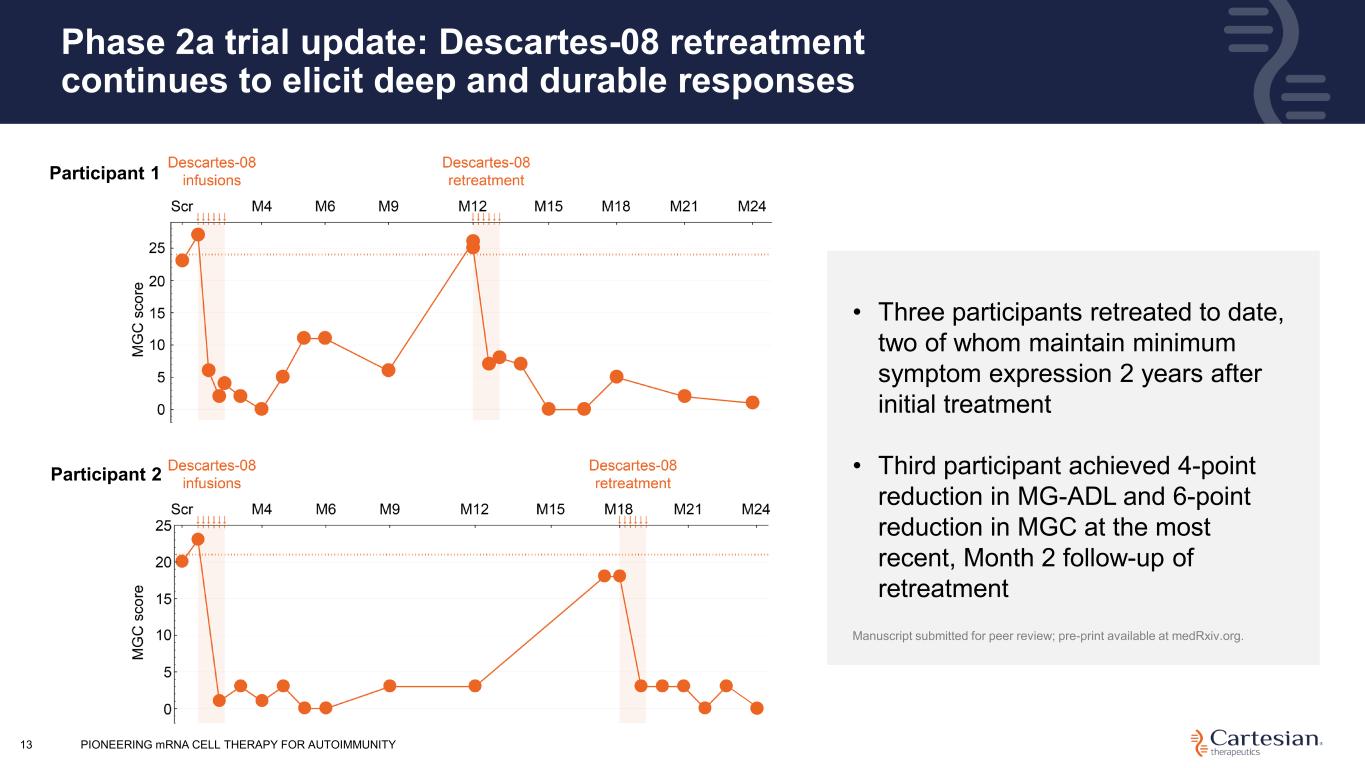 PIONEERING mRNA CELL THERAPY FOR AUTOIMMUNITY12 Safety profile supports outpatient administration Descartes-08 (n=20) Placebo (n=16) Grade 1 Grade 2 Grade 3 Grade 1 Grade 2 Grade 3 Headache 7 (35%) 4 (20%) 2 (13%) 3 (19%) Chills 8 (40%) 4 (20%) Nausea 3 (15%) 6 (30%) 1 (6%) 2 (13%) Fever 7 (35%) 4 (20%) 1 (5%) Fatigue 4 (20%) 1 (5%) 1 (6%) Myalgia 4 (20%) 2 (10%) Infusion related reaction 1 (5%) 2 (10%) 1 (5%) 1 (6%) Muscle weakness 1 (5%) 1 (5%) 1 (6%) Arthralgia 1 (5%) 1 (5%) 1 (6%) Tachycardia 3 (15%) Upper respiratory infection 1 (5%) 1 (6%) Herpes simplex reactivation 1 (5%) 1 (5%) Dysgeusia 3 (15%) Diarrhea 1 (5%) 1 (6%) Sweating 1 (5%) 1 (6%) Limb edema 1 (5%) 1 (5%) Flushing 2 (10%) Dyspnea 1 (5%) 1 (5%) Insomnia 2 (10%) Vomiting 2 (10%) 1 (5%) Tremor 2 (10%) • No new type of AEs reported • No hypogammaglobulinemia or increased infections reported • No difference in vaccine titers between Descartes-08 and placebo Safety dataset comprises all subjects who received at least one dose of Descartes-08 (n=20) or placebo (n=16). All Grade 1–2 adverse events deemed possibly, probably or definitely related to the study drug with a cumulative incidence ≥10% and all Grade 3 adverse events deemed possibly, probably or definitely related to the study drug are reported. There were no Grade 4 adverse events AE, Adverse event