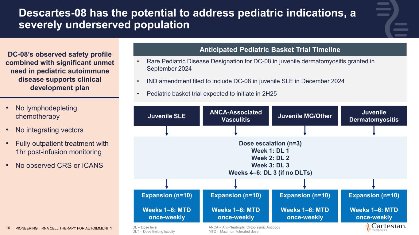 Intend to leverage the potential of Descartes-08 across multiple clinical programs PIONEERING mRNA CELL THERAPY FOR AUTOIMMUNITY15 • Plan to initiate Phase 3 AURORA clinical trial in 1H 2025 • RMAT designation expected to support efficient development plan in collaboration with FDA MG SLE Potential New Indications Leveraging clinical proof-of-concept of Descartes-08 in MG to expand autoimmune pipeline • Open-label Phase 2 trial ongoing • Data readout expected in 2H25 • IND amendment filed for pediatric basket trial in certain autoimmune diseases • Trial expected to initiate in 2H25