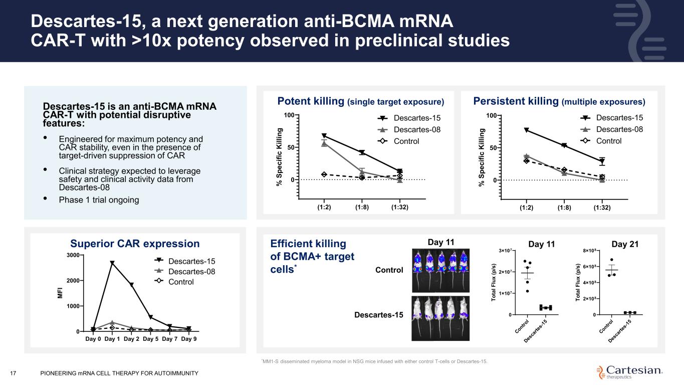 PIONEERING mRNA CELL THERAPY FOR AUTOIMMUNITY16 Descartes-08 has the potential to address pediatric indications, a severely underserved population • Rare Pediatric Disease Designation for DC-08 in juvenile dermatomyositis granted in September 2024 • IND amendment filed to include DC-08 in juvenile SLE in December 2024 • Pediatric basket trial expected to initiate in 2H25 DL – Dose level DLT – Dose limiting toxicity Juvenile SLE Dose escalation (n=3) Week 1: DL 1 Week 2: DL 2 Week 3: DL 3 Weeks 4–6: DL 3 (if no DLTs) Expansion (n=10) Weeks 1–6: MTD once-weekly ANCA-Associated Vasculitis Juvenile MG/Other Juvenile Dermatomyositis Expansion (n=10) Weeks 1–6: MTD once-weekly Expansion (n=10) Weeks 1–6: MTD once-weekly Expansion (n=10) Weeks 1–6: MTD once-weekly • No lymphodepleting chemotherapy • No integrating vectors • Fully outpatient treatment with 1hr post-infusion monitoring • No observed CRS or ICANS DC-08’s observed safety profile combined with significant unmet need in pediatric autoimmune disease supports clinical development plan Anticipated Pediatric Basket Trial Timeline ANCA – Anti-Neutrophil Cytoplasmic Antibody MTD – Maximum tolerated dose