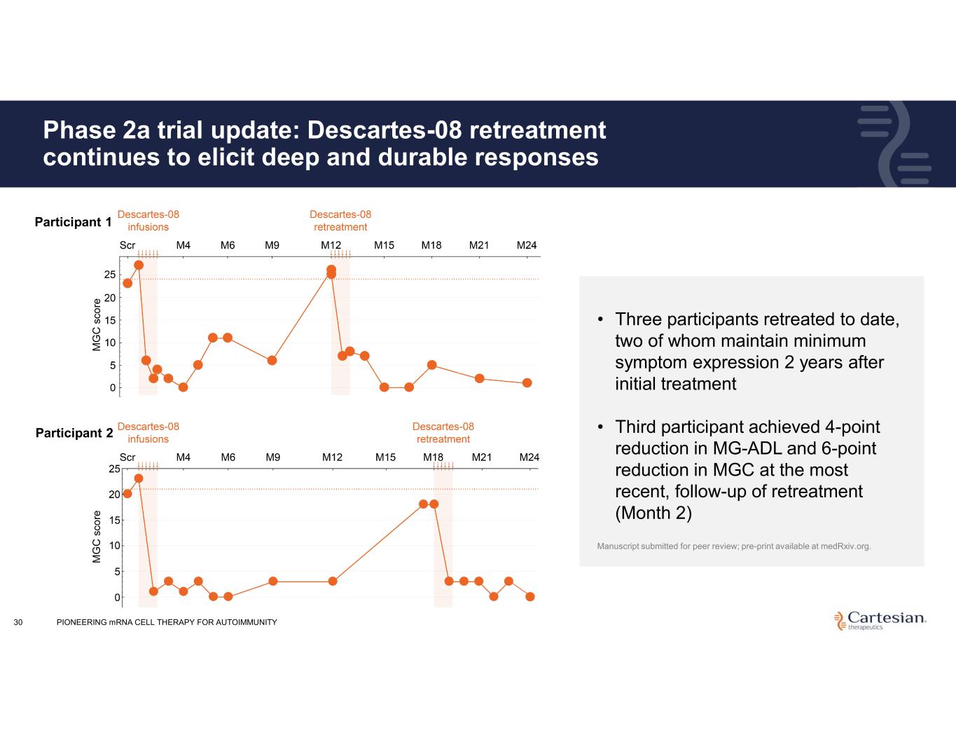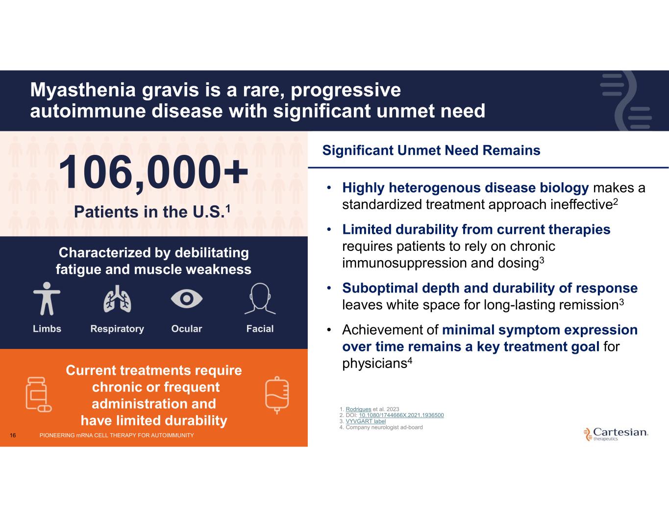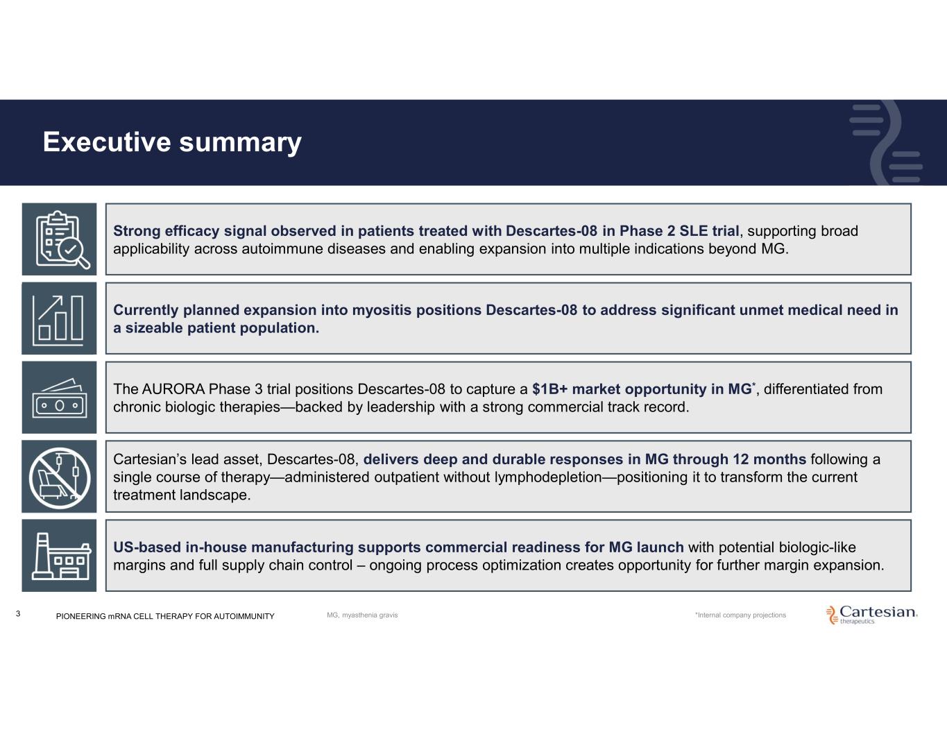 Disclosures For the purposes of this notice, the “presentation” that follows shall mean and include the slides that follow, the oral presentation of the slides by members of management of Cartesian Therapeutics, Inc. (the “Company”) or any person on their behalf, any question-and-answer session that follows such oral presentation, hard copies of this document and any materials distributed at, or in connection with, such oral presentation. Information in this presentation (including market data and statistical information) has been obtained from various sources (including third-party sources) and the Company does not guarantee the accuracy or completeness of such information. All projections, valuations and statistical analyses are provided for informational purposes only. They may be based on subjective assessments and assumptions and may use one among many alternative methodologies that produce different results and, to the extent they are based on historical information, they should not be relied upon as an accurate prediction of future performance, and you are cautioned not to give undue weight to them. The Company’s product candidates are investigational clinical product candidates currently under clinical evaluation and study. The Company’s product candidates have not been approved for use by the U.S. Food and Drug Administration ("FDA"). Any reference to the Company’s product candidates’ potential benefits, safety, or efficacy is based on observations from ongoing clinical research and should not be interpreted as definitive clinical evidence. Use or discussion of the Company’s product candidates is limited to the context of clinical research and free scientific exchange of information and is not intended for the general public, as medical advice, nor as any suggestion or indication that the Company’s product candidates have been found by the FDA to be safe or effective or approved for use outside of clinical trials. Forward-looking Statements Any statements in this presentation about the future expectations, plans and prospects of the Company, including without limitation, statements about the Company’s expected cash resources and cash runway, statements regarding the ability of the Company’s product candidates to be administered in an outpatient setting or without the need for preconditioning lymphodepleting chemotherapy, the potential of the Company’s product candidates to treat myasthenia gravis, juvenile myasthenia gravis, systemic lupus erythematosus, myositis, juvenile systemic lupus erythematosus, juvenile dermatomyositis, or any other disease, the anticipated timing or the outcome of ongoing and planned clinical trials, studies and data readouts, the anticipated timing or the outcome of the FDA’s review of the Company’s regulatory filings, including the number of trials that may be necessary in order to obtain marketing approval, the Company’s ability to conduct its clinical trials and preclinical studies, the timing or making of any regulatory filings, the anticipated timing or outcome of selection of developmental product candidates, the novelty of treatment paradigms that the Company is able to develop, the potential of any therapies developed by the Company to fulfill unmet medical needs, enrollment in the Company’s clinical trials, expectations regarding manufacturing and other statements containing the words “anticipate,” “believe,” “continue,” “could,” “estimate,” “expect,” “hypothesize,” “intend,” “may,” “plan,” “potential,” “predict,” “project,” “should,” “target,” “would,” and similar expressions, constitute forward-looking statements within the meaning of The Private Securities Litigation Reform Act of 1995. Actual results may differ materially from those indicated by such forward-looking statements as a result of various important factors, including, but not limited to, the following: the uncertainties inherent in the initiation, completion and cost of clinical trials including proof of concept trials, including uncertain outcomes, the availability and timing of data from ongoing and future clinical trials and the results of such trials, whether preliminary results from a particular clinical trial will be predictive of the final results of that trial, whether results of early clinical trials will be indicative of the results of later clinical trials and whether results observed in certain patient subgroups will be indicative of the results in such subgroups in later clinical trials or are reflective of a product candidate's overall characteristics, the ability to predict results of studies performed on human beings based on results of studies performed on non-human subjects, the unproven approach of the Company’s technology, potential delays in enrollment of patients, undesirable side effects of the Company’s product candidates, political uncertainty, the Company’s reliance on third parties to conduct its clinical trials, the Company’s inability to maintain its existing or future collaborations, licenses or contractual relationships, its inability to protect its proprietary technology and intellectual property, potential delays in regulatory approvals, the availability of funding sufficient for its foreseeable and unforeseeable operating expenses and capital expenditure requirements, the Company’s recurring losses from operations and negative cash flows, substantial fluctuation in the price of the Company’s common stock, risks related to geopolitical conflicts and pandemics and other important factors discussed in the “Risk Factors” section of the Company’s most recent Annual Report on Form 10-K and subsequently filed Quarterly Reports on Form 10-Q, and in other filings that the Company makes with the Securities and Exchange Commission. In addition, any forward-looking statements included in this presentation represent the Company’s views only a