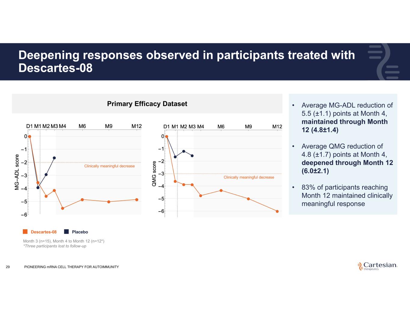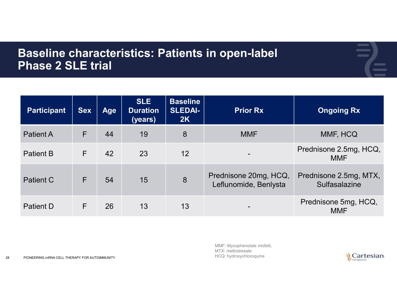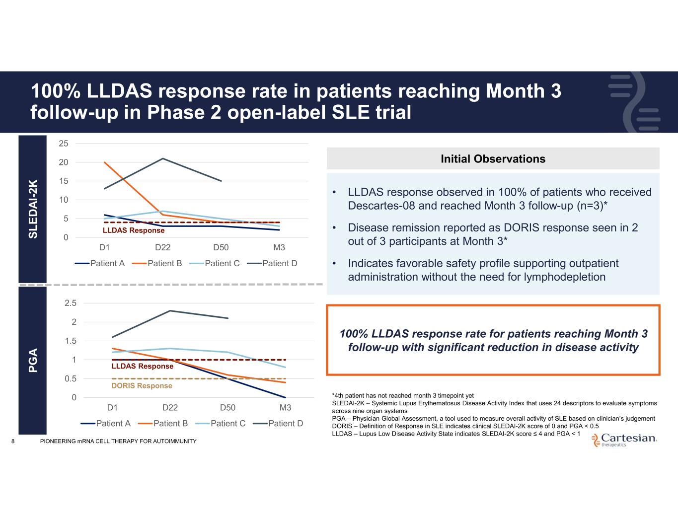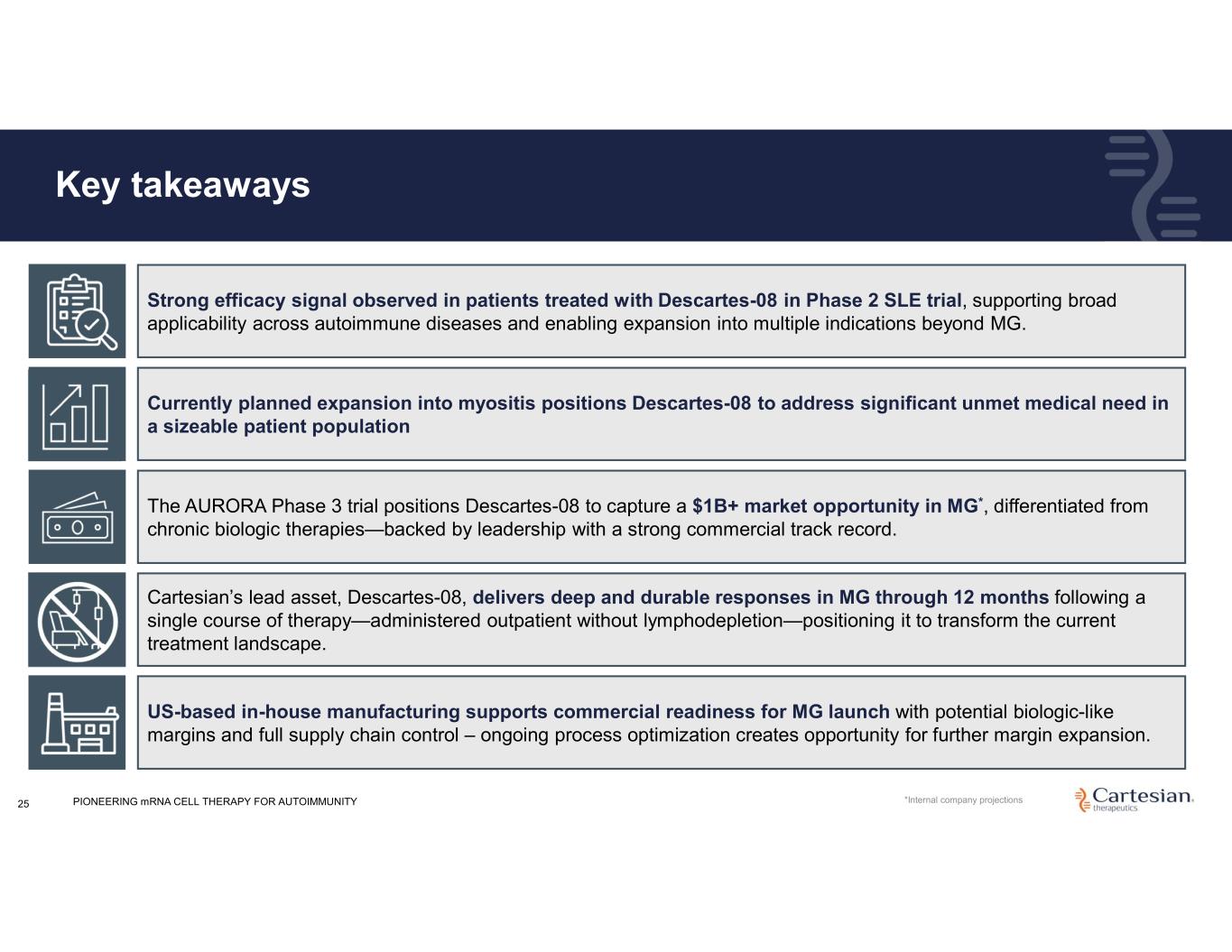 Disclosures For the purposes of this notice, the “presentation” that follows shall mean and include the slides that follow, the oral presentation of the slides by members of management of Cartesian Therapeutics, Inc. (the “Company”) or any person on their behalf, any question-and-answer session that follows such oral presentation, hard copies of this document and any materials distributed at, or in connection with, such oral presentation. Information in this presentation (including market data and statistical information) has been obtained from various sources (including third-party sources) and the Company does not guarantee the accuracy or completeness of such information. All projections, valuations and statistical analyses are provided for informational purposes only. They may be based on subjective assessments and assumptions and may use one among many alternative methodologies that produce different results and, to the extent they are based on historical information, they should not be relied upon as an accurate prediction of future performance, and you are cautioned not to give undue weight to them. The Company’s product candidates are investigational clinical product candidates currently under clinical evaluation and study. The Company’s product candidates have not been approved for use by the U.S. Food and Drug Administration ("FDA"). Any reference to the Company’s product candidates’ potential benefits, safety, or efficacy is based on observations from ongoing clinical research and should not be interpreted as definitive clinical evidence. Use or discussion of the Company’s product candidates is limited to the context of clinical research and free scientific exchange of information and is not intended for the general public, as medical advice, nor as any suggestion or indication that the Company’s product candidates have been found by the FDA to be safe or effective or approved for use outside of clinical trials. Forward-looking Statements Any statements in this presentation about the future expectations, plans and prospects of the Company, including without limitation, statements about the Company’s expected cash resources and cash runway, statements regarding the ability of the Company’s product candidates to be administered in an outpatient setting or without the need for preconditioning lymphodepleting chemotherapy, the potential of the Company’s product candidates to treat myasthenia gravis, juvenile myasthenia gravis, systemic lupus erythematosus, myositis, juvenile systemic lupus erythematosus, juvenile dermatomyositis, or any other disease, the anticipated timing or the outcome of ongoing and planned clinical trials, studies and data readouts, the anticipated timing or the outcome of the FDA’s review of the Company’s regulatory filings, including the number of trials that may be necessary in order to obtain marketing approval, the Company’s ability to conduct its clinical trials and preclinical studies, the timing or making of any regulatory filings, the anticipated timing or outcome of selection of developmental product candidates, the novelty of treatment paradigms that the Company is able to develop, the potential of any therapies developed by the Company to fulfill unmet medical needs, enrollment in the Company’s clinical trials, expectations regarding manufacturing and other statements containing the words “anticipate,” “believe,” “continue,” “could,” “estimate,” “expect,” “hypothesize,” “intend,” “may,” “plan,” “potential,” “predict,” “project,” “should,” “target,” “would,” and similar expressions, constitute forward-looking statements within the meaning of The Private Securities Litigation Reform Act of 1995. Actual results may differ materially from those indicated by such forward-looking statements as a result of various important factors, including, but not limited to, the following: the uncertainties inherent in the initiation, completion and cost of clinical trials including proof of concept trials, including uncertain outcomes, the availability and timing of data from ongoing and future clinical trials and the results of such trials, whether preliminary results from a particular clinical trial will be predictive of the final results of that trial, whether results of early clinical trials will be indicative of the results of later clinical trials and whether results observed in certain patient subgroups will be indicative of the results in such subgroups in later clinical trials or are reflective of a product candidate's overall characteristics, the ability to predict results of studies performed on human beings based on results of studies performed on non-human subjects, the unproven approach of the Company’s technology, potential delays in enrollment of patients, undesirable side effects of the Company’s product candidates, political uncertainty, the Company’s reliance on third parties to conduct its clinical trials, the Company’s inability to maintain its existing or future collaborations, licenses or contractual relationships, its inability to protect its proprietary technology and intellectual property, potential delays in regulatory approvals, the availability of funding sufficient for its foreseeable and unforeseeable operating expenses and capital expenditure requirements, the Company’s recurring losses from operations and negative cash flows, substantial fluctuation in the price of the Company’s common stock, risks related to geopolitical conflicts and pandemics and other important factors discussed in the “Risk Factors” section of the Company’s most recent Annual Report on Form 10-K and subsequently filed Quarterly Reports on Form 10-Q, and in other filings that the Company makes with the Securities and Exchange Commission. In addition, any forward-looking statements included in this presentation represent the Company’s views only a