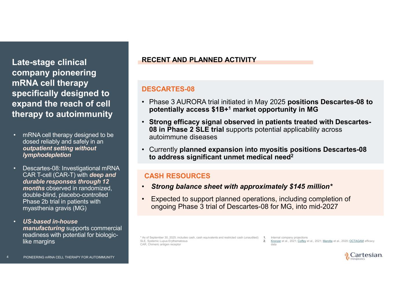 Executive summary 3 Cartesian’s lead asset, Descartes-08, delivers deep and durable responses in MG through 12 months following a single course of therapy—administered outpatient without lymphodepletion—positioning it to transform the current treatment landscape. The AURORA Phase 3 trial positions Descartes-08 to capture a $1B+ market opportunity in MG*, differentiated from chronic biologic therapies—backed by leadership with a strong commercial track record. US-based in-house manufacturing supports commercial readiness for MG launch with potential biologic-like margins and full supply chain control – ongoing process optimization creates opportunity for further margin expansion. Currently planned expansion into myositis positions Descartes-08 to address significant unmet medical need in a sizeable patient population. Strong efficacy signal observed in patients treated with Descartes-08 in Phase 2 SLE trial, supporting broad applicability across autoimmune diseases and enabling expansion into multiple indications beyond MG. *Internal company projectionsPIONEERING mRNA CELL THERAPY FOR AUTOIMMUNITY MG, myasthenia gravis