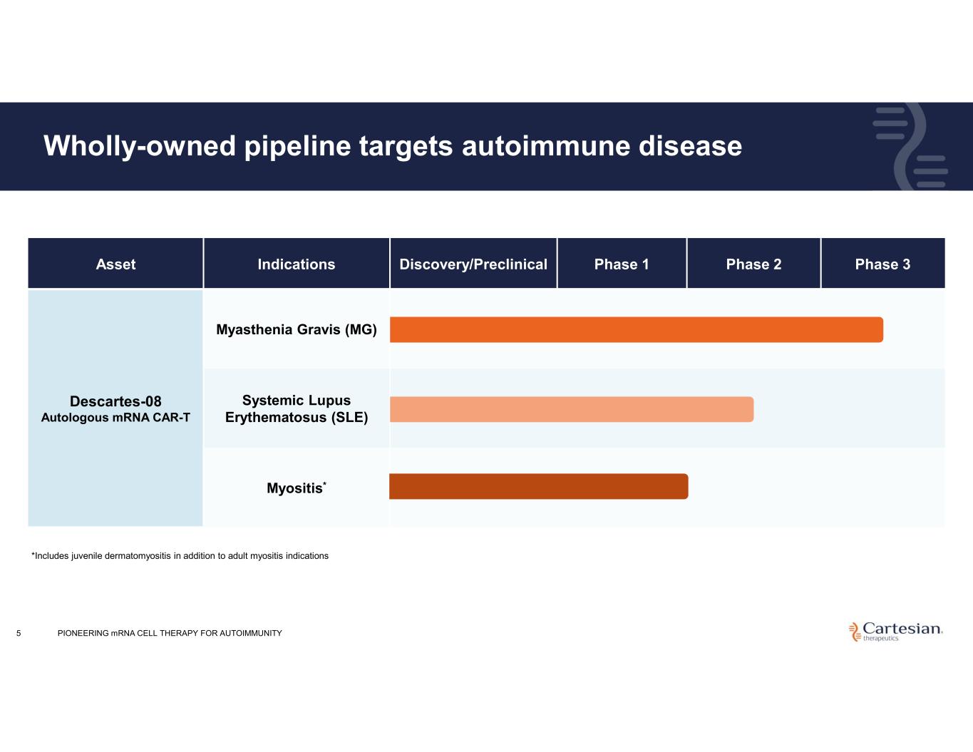4 Late-stage clinical company pioneering mRNA cell therapy specifically designed to expand the reach of cell therapy to autoimmunity • mRNA cell therapy designed to be dosed reliably and safely in an outpatient setting without lymphodepletion • Descartes-08: Investigational mRNA CAR T-cell (CAR-T) with deep and durable responses through 12 months observed in randomized, double-blind, placebo-controlled Phase 2b trial in patients with myasthenia gravis (MG) • US-based in-house manufacturing supports commercial readiness with potential for biologic- like margins * As of September 30, 2025; includes cash, cash equivalents and restricted cash (unaudited) SLE, Systemic Lupus Erythematosus CAR, Chimeric antigen receptor • Phase 3 AURORA trial initiated in May 2025 positions Descartes-08 to potentially access $1B+1 market opportunity in MG • Strong efficacy signal observed in patients treated with Descartes- 08 in Phase 2 SLE trial supports potential applicability across autoimmune diseases • Currently planned expansion into myositis positions Descartes-08 to address significant unmet medical need2 DESCARTES-08 RECENT AND PLANNED ACTIVITY • Strong balance sheet with approximately $145 million* • Expected to support planned operations, including completion of ongoing Phase 3 trial of Descartes-08 for MG, into mid-2027 CASH RESOURCES 1. Internal company projections 2. Kronzer et al., 2021; Coffey et al., 2021; Marotta et al., 2020; OCTAGAM efficacy data PIONEERING mRNA CELL THERAPY FOR AUTOIMMUNITY
