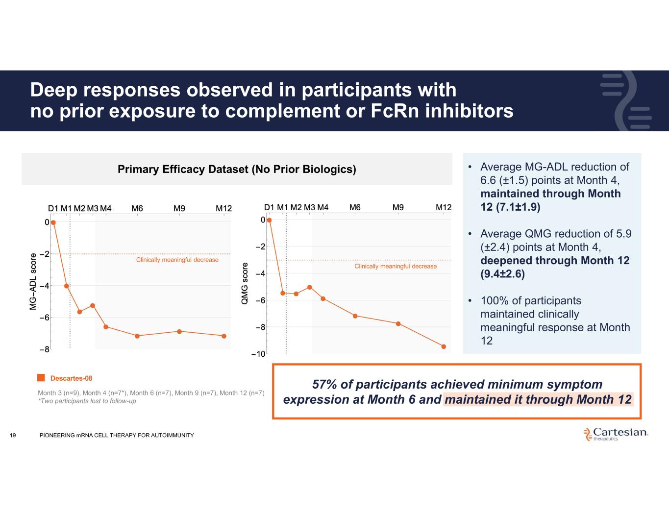 18 AURORA: Randomized double-blind, placebo-controlled Phase 3 trial of Descartes-08 in AChR Ab+ gMG initiated in May 2025 WK1 Masked Dosing Six weekly doses of Descartes-08 or placebo PRIMARY ENDPOINT • Proportion of participants with MG-ADL improvement of ≥3 points at Month 4, relative to placebo • Proportion of participants with MGC improvement of ≥4 points at Month 4 WK6 WK8 WK12 WK16 Masked Follow-Up Month 1, Month 2, Month 3, Month 4 Primary Endpoint Assessment Optional Descartes-08 infusions Follow-Up Month 5, Month 6, Month 9, Month 12 Follow-Up Month 5, Month 6, Month 9, Month 12Descartes-08 Placebo ~100 Participants 1:1 INCLUSION CRITERIA • AChR Ab+ • MGFA Class II-IV • MG-ADL ≥6 • On stable doses of immunosuppressants Single infusion MG-ADL, Myasthenia Gravis Activities of Daily Living scale gMG, Generalized myasthenia gravis MGFA, Myasthenia Gravis Foundation of America MGC, Myasthenia Gravis Composite MG QMG, Quantitative MG Scores MG QoL 15R, MG Quality of Life 15-revised AChR Ab+, Acetylcholine receptor autoantibody positive KEY SECONDARY ENDPOINTS • MG-ADL and MGC change from baseline to Month 4 • Quantify clinical effect of Descartes-08 over 1 year PIONEERING mRNA CELL THERAPY FOR AUTOIMMUNITY