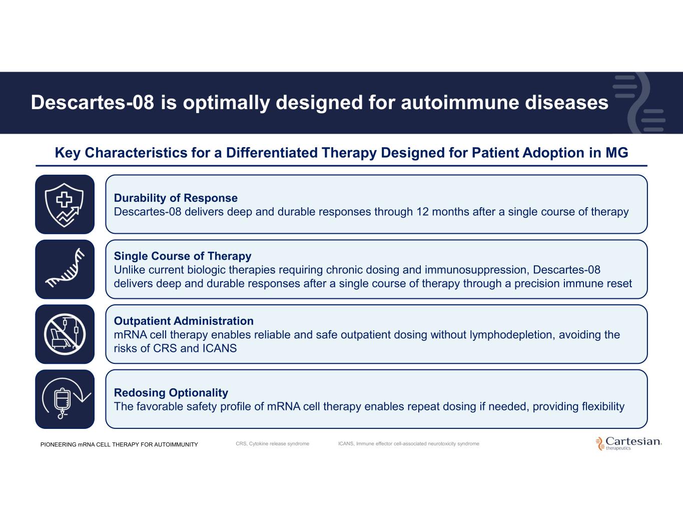 Descartes-08 is optimally designed for autoimmune diseases Key Characteristics for a Differentiated Therapy Designed for Patient Adoption in MG Durability of Response Descartes-08 delivers deep and durable responses through 12 months after a single course of therapy Single Course of Therapy Unlike current biologic therapies requiring chronic dosing and immunosuppression, Descartes-08 delivers deep and durable responses after a single course of therapy through a precision immune reset Outpatient Administration mRNA cell therapy enables reliable and safe outpatient dosing without lymphodepletion, avoiding the risks of CRS and ICANS Redosing Optionality The favorable safety profile of mRNA cell therapy enables repeat dosing if needed, providing flexibility PIONEERING mRNA CELL THERAPY FOR AUTOIMMUNITY CRS, Cytokine release syndrome ICANS, Immune effector cell-associated neurotoxicity syndrome