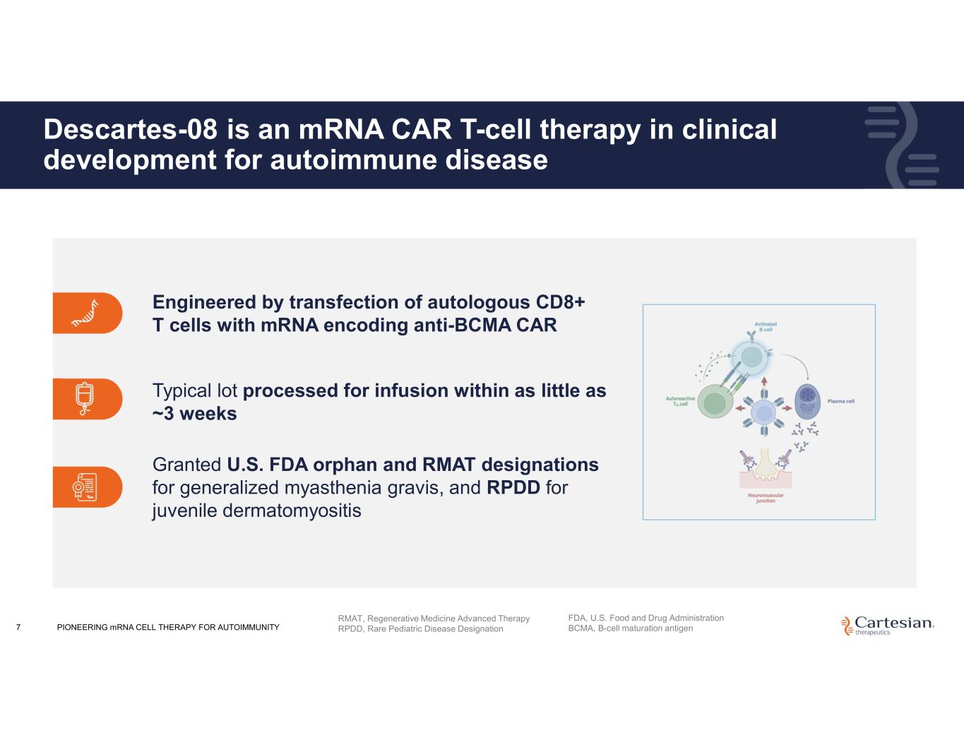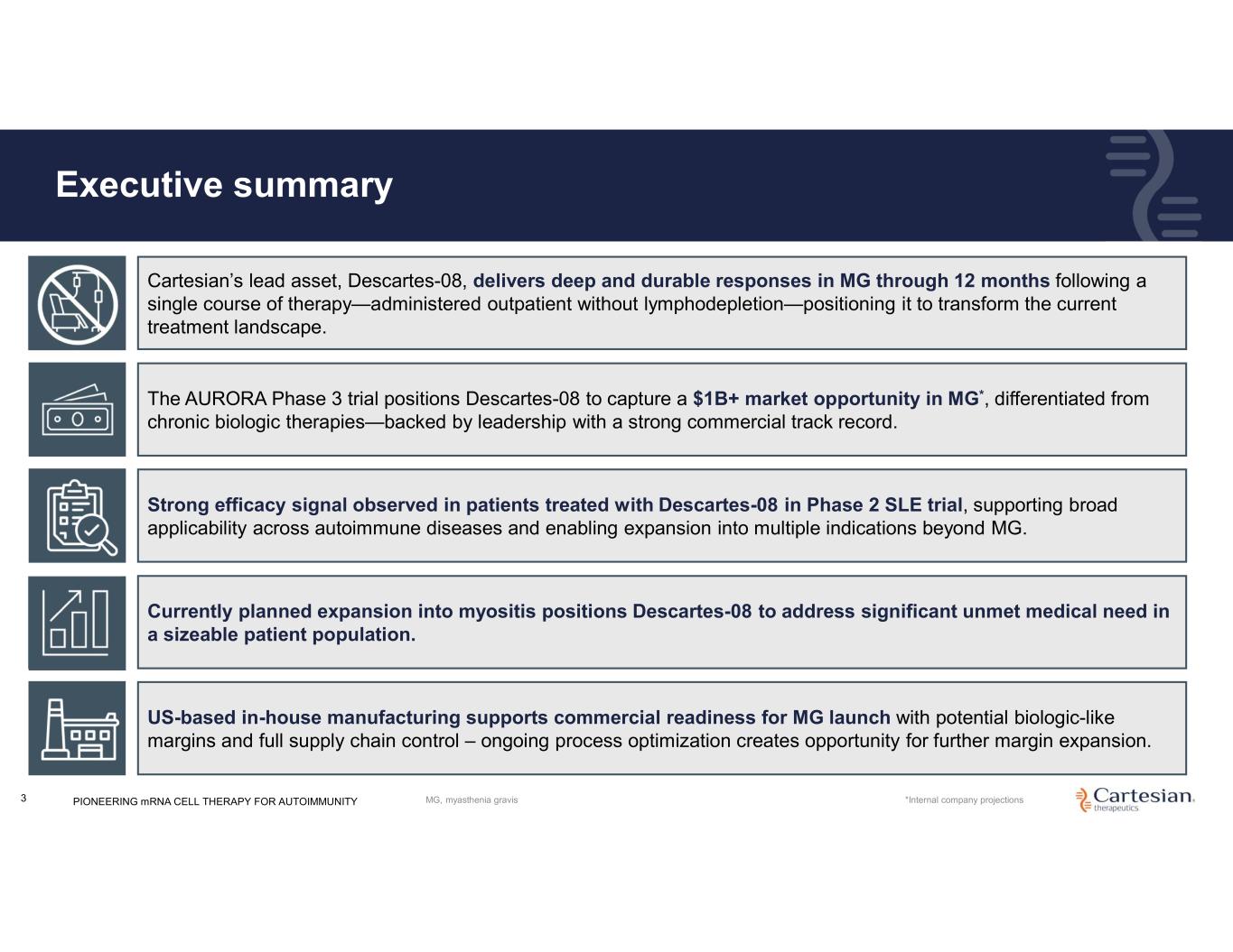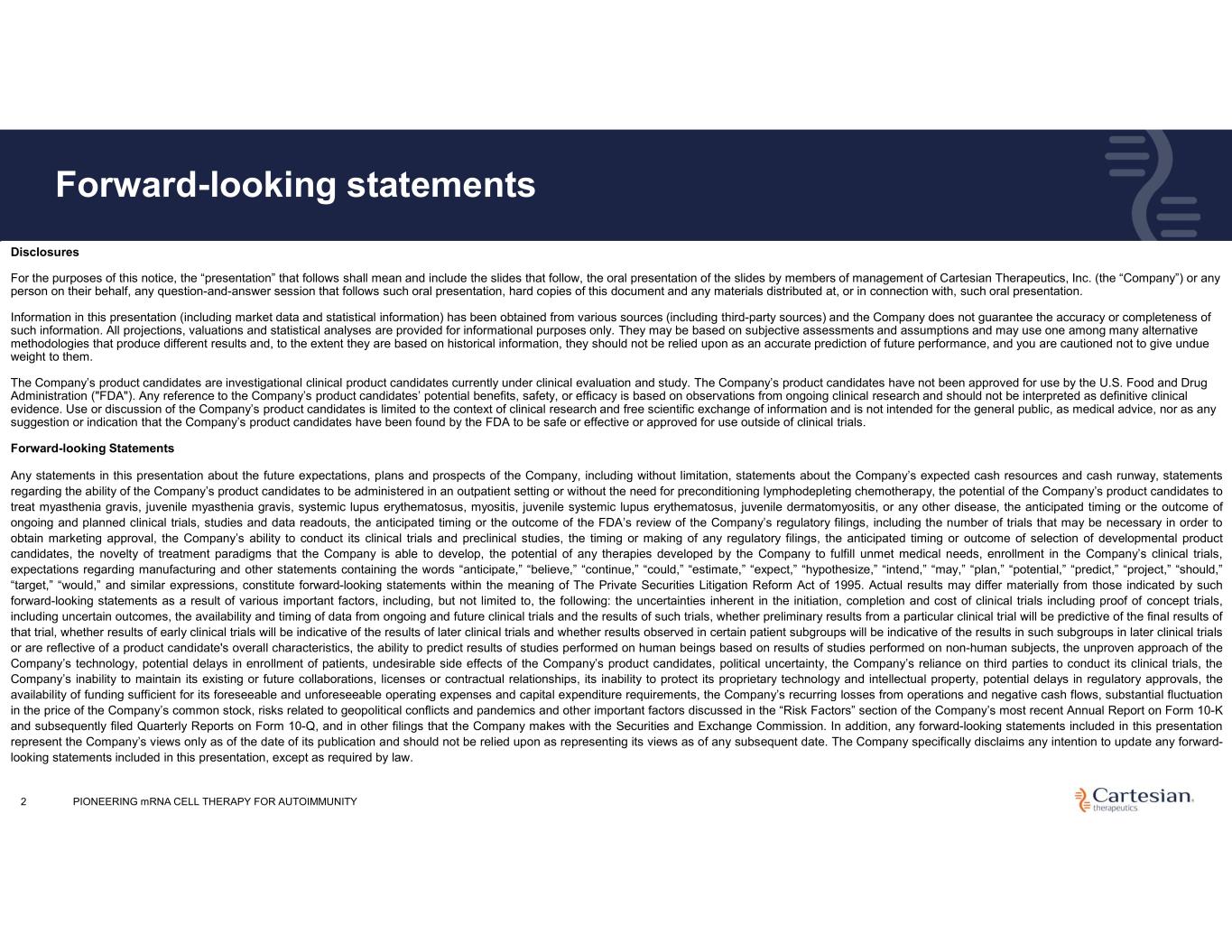 Disclosures For the purposes of this notice, the “presentation” that follows shall mean and include the slides that follow, the oral presentation of the slides by members of management of Cartesian Therapeutics, Inc. (the “Company”) or any person on their behalf, any question-and-answer session that follows such oral presentation, hard copies of this document and any materials distributed at, or in connection with, such oral presentation. Information in this presentation (including market data and statistical information) has been obtained from various sources (including third-party sources) and the Company does not guarantee the accuracy or completeness of such information. All projections, valuations and statistical analyses are provided for informational purposes only. They may be based on subjective assessments and assumptions and may use one among many alternative methodologies that produce different results and, to the extent they are based on historical information, they should not be relied upon as an accurate prediction of future performance, and you are cautioned not to give undue weight to them. The Company’s product candidates are investigational clinical product candidates currently under clinical evaluation and study. The Company’s product candidates have not been approved for use by the U.S. Food and Drug Administration ("FDA"). Any reference to the Company’s product candidates’ potential benefits, safety, or efficacy is based on observations from ongoing clinical research and should not be interpreted as definitive clinical evidence. Use or discussion of the Company’s product candidates is limited to the context of clinical research and free scientific exchange of information and is not intended for the general public, as medical advice, nor as any suggestion or indication that the Company’s product candidates have been found by the FDA to be safe or effective or approved for use outside of clinical trials. Forward-looking Statements Any statements in this presentation about the future expectations, plans and prospects of the Company, including without limitation, statements about the Company’s expected cash resources and cash runway, statements regarding the ability of the Company’s product candidates to be administered in an outpatient setting or without the need for preconditioning lymphodepleting chemotherapy, the potential of the Company’s product candidates to treat myasthenia gravis, juvenile myasthenia gravis, systemic lupus erythematosus, myositis, juvenile systemic lupus erythematosus, juvenile dermatomyositis, or any other disease, the anticipated timing or the outcome of ongoing and planned clinical trials, studies and data readouts, the anticipated timing or the outcome of the FDA’s review of the Company’s regulatory filings, including the number of trials that may be necessary in order to obtain marketing approval, the Company’s ability to conduct its clinical trials and preclinical studies, the timing or making of any regulatory filings, the anticipated timing or outcome of selection of developmental product candidates, the novelty of treatment paradigms that the Company is able to develop, the potential of any therapies developed by the Company to fulfill unmet medical needs, enrollment in the Company’s clinical trials, expectations regarding manufacturing and other statements containing the words “anticipate,” “believe,” “continue,” “could,” “estimate,” “expect,” “hypothesize,” “intend,” “may,” “plan,” “potential,” “predict,” “project,” “should,” “target,” “would,” and similar expressions, constitute forward-looking statements within the meaning of The Private Securities Litigation Reform Act of 1995. Actual results may differ materially from those indicated by such forward-looking statements as a result of various important factors, including, but not limited to, the following: the uncertainties inherent in the initiation, completion and cost of clinical trials including proof of concept trials, including uncertain outcomes, the availability and timing of data from ongoing and future clinical trials and the results of such trials, whether preliminary results from a particular clinical trial will be predictive of the final results of that trial, whether results of early clinical trials will be indicative of the results of later clinical trials and whether results observed in certain patient subgroups will be indicative of the results in such subgroups in later clinical trials or are reflective of a product candidate's overall characteristics, the ability to predict results of studies performed on human beings based on results of studies performed on non-human subjects, the unproven approach of the Company’s technology, potential delays in enrollment of patients, undesirable side effects of the Company’s product candidates, political uncertainty, the Company’s reliance on third parties to conduct its clinical trials, the Company’s inability to maintain its existing or future collaborations, licenses or contractual relationships, its inability to protect its proprietary technology and intellectual property, potential delays in regulatory approvals, the availability of funding sufficient for its foreseeable and unforeseeable operating expenses and capital expenditure requirements, the Company’s recurring losses from operations and negative cash flows, substantial fluctuation in the price of the Company’s common stock, risks related to geopolitical conflicts and pandemics and other important factors discussed in the “Risk Factors” section of the Company’s most recent Annual Report on Form 10-K and subsequently filed Quarterly Reports on Form 10-Q, and in other filings that the Company makes with the Securities and Exchange Commission. In addition, any forward-looking statements included in this presentation represent the Company’s views only a