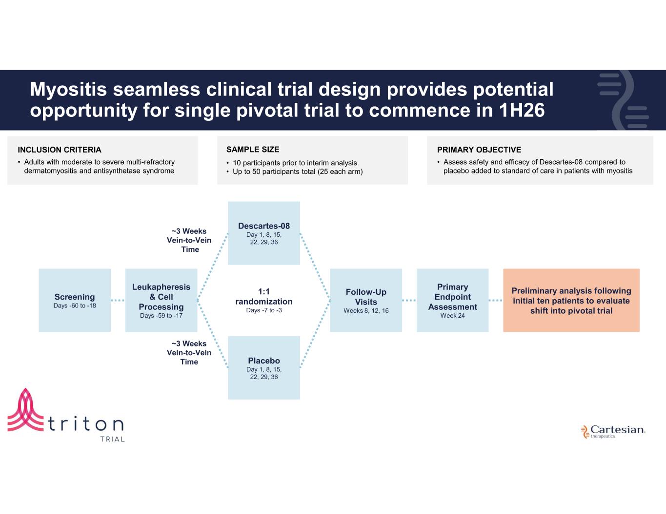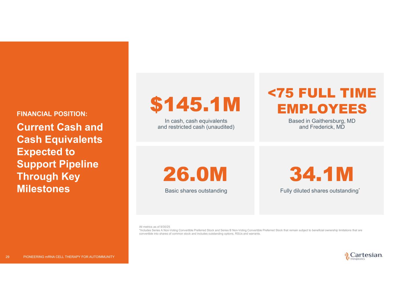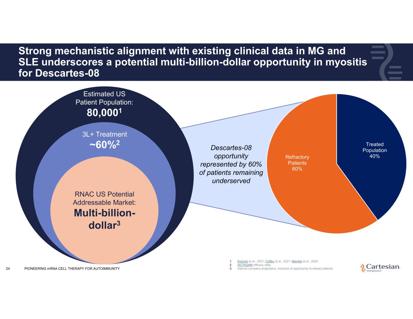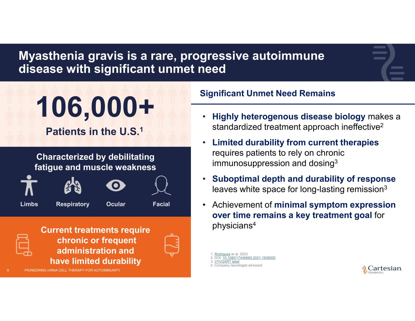 Disclosures For the purposes of this notice, the “presentation” that follows shall mean and include the slides that follow, the oral presentation of the slides by members of management of Cartesian Therapeutics, Inc. (the “Company”) or any person on their behalf, any question-and-answer session that follows such oral presentation, hard copies of this document and any materials distributed at, or in connection with, such oral presentation. Information in this presentation (including market data and statistical information) has been obtained from various sources (including third-party sources) and the Company does not guarantee the accuracy or completeness of such information. All projections, valuations and statistical analyses are provided for informational purposes only. They may be based on subjective assessments and assumptions and may use one among many alternative methodologies that produce different results and, to the extent they are based on historical information, they should not be relied upon as an accurate prediction of future performance, and you are cautioned not to give undue weight to them. The Company’s product candidates are investigational clinical product candidates currently under clinical evaluation and study. The Company’s product candidates have not been approved for use by the U.S. Food and Drug Administration ("FDA"). Any reference to the Company’s product candidates’ potential benefits, safety, or efficacy is based on observations from ongoing clinical research and should not be interpreted as definitive clinical evidence. Use or discussion of the Company’s product candidates is limited to the context of clinical research and free scientific exchange of information and is not intended for the general public, as medical advice, nor as any suggestion or indication that the Company’s product candidates have been found by the FDA to be safe or effective or approved for use outside of clinical trials. Forward-looking Statements Any statements in this presentation about the future expectations, plans and prospects of the Company, including without limitation, statements about the Company’s expected cash resources and cash runway, statements regarding the ability of the Company’s product candidates to be administered in an outpatient setting or without the need for preconditioning lymphodepleting chemotherapy, the potential of the Company’s product candidates to treat myasthenia gravis, juvenile myasthenia gravis, systemic lupus erythematosus, myositis, juvenile systemic lupus erythematosus, juvenile dermatomyositis, or any other disease, the anticipated timing or the outcome of ongoing and planned clinical trials, studies and data readouts, the anticipated timing or the outcome of the FDA’s review of the Company’s regulatory filings, including the number of trials that may be necessary in order to obtain marketing approval, the Company’s ability to conduct its clinical trials and preclinical studies, the timing or making of any regulatory filings, the anticipated timing or outcome of selection of developmental product candidates, the novelty of treatment paradigms that the Company is able to develop, the potential of any therapies developed by the Company to fulfill unmet medical needs, enrollment in the Company’s clinical trials, expectations regarding manufacturing and other statements containing the words “anticipate,” “believe,” “continue,” “could,” “estimate,” “expect,” “hypothesize,” “intend,” “may,” “plan,” “potential,” “predict,” “project,” “should,” “target,” “would,” and similar expressions, constitute forward-looking statements within the meaning of The Private Securities Litigation Reform Act of 1995. Actual results may differ materially from those indicated by such forward-looking statements as a result of various important factors, including, but not limited to, the following: the uncertainties inherent in the initiation, completion and cost of clinical trials including proof of concept trials, including uncertain outcomes, the availability and timing of data from ongoing and future clinical trials and the results of such trials, whether preliminary results from a particular clinical trial will be predictive of the final results of that trial, whether results of early clinical trials will be indicative of the results of later clinical trials and whether results observed in certain patient subgroups will be indicative of the results in such subgroups in later clinical trials or are reflective of a product candidate's overall characteristics, the ability to predict results of studies performed on human beings based on results of studies performed on non-human subjects, the unproven approach of the Company’s technology, potential delays in enrollment of patients, undesirable side effects of the Company’s product candidates, political uncertainty, the Company’s reliance on third parties to conduct its clinical trials, the Company’s inability to maintain its existing or future collaborations, licenses or contractual relationships, its inability to protect its proprietary technology and intellectual property, potential delays in regulatory approvals, the availability of funding sufficient for its foreseeable and unforeseeable operating expenses and capital expenditure requirements, the Company’s recurring losses from operations and negative cash flows, substantial fluctuation in the price of the Company’s common stock, risks related to geopolitical conflicts and pandemics and other important factors discussed in the “Risk Factors” section of the Company’s most recent Annual Report on Form 10-K and subsequently filed Quarterly Reports on Form 10-Q, and in other filings that the Company makes with the Securities and Exchange Commission. In addition, any forward-looking statements included in this presentation represent the Company’s views only a