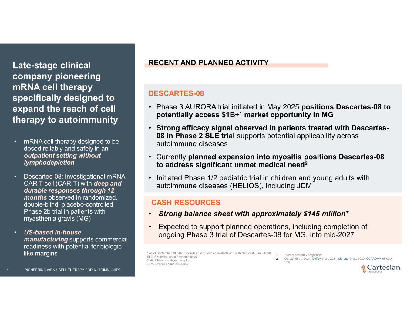 Executive summary 3 Cartesian’s lead asset, Descartes-08, delivers deep and durable responses in MG through 12 months following a single course of therapy—administered outpatient without lymphodepletion—positioning it to transform the current treatment landscape. The AURORA Phase 3 trial positions Descartes-08 to capture a $1B+ market opportunity in MG*, differentiated from chronic biologic therapies—backed by leadership with a strong commercial track record. US-based in-house manufacturing supports commercial readiness for MG launch with potential biologic-like margins and full supply chain control – ongoing process optimization creates opportunity for further margin expansion. Currently planned expansion into myositis positions Descartes-08 to address significant unmet medical need in a sizeable patient population. Strong efficacy signal observed in patients treated with Descartes-08 in Phase 2 SLE trial, supporting broad applicability across autoimmune diseases and enabling expansion into multiple indications beyond MG. *Internal company projectionsPIONEERING mRNA CELL THERAPY FOR AUTOIMMUNITY MG, myasthenia gravis