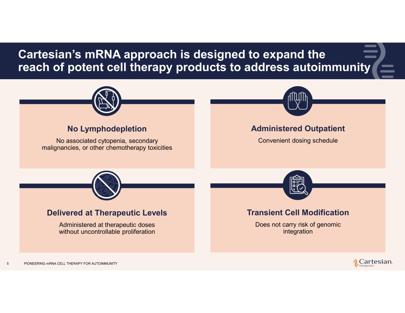 4 Late-stage clinical company pioneering mRNA cell therapy specifically designed to expand the reach of cell therapy to autoimmunity • mRNA cell therapy designed to be dosed reliably and safely in an outpatient setting without lymphodepletion • Descartes-08: Investigational mRNA CAR T-cell (CAR-T) with deep and durable responses through 12 months observed in randomized, double-blind, placebo-controlled Phase 2b trial in patients with myasthenia gravis (MG) • US-based in-house manufacturing supports commercial readiness with potential for biologic- like margins * As of September 30, 2025; includes cash, cash equivalents and restricted cash (unaudited) SLE, Systemic Lupus Erythematosus CAR, Chimeric antigen receptor JDM, juvenile dermatomyositis • Phase 3 AURORA trial initiated in May 2025 positions Descartes-08 to potentially access $1B+1 market opportunity in MG • Strong efficacy signal observed in patients treated with Descartes- 08 in Phase 2 SLE trial supports potential applicability across autoimmune diseases • Currently planned expansion into myositis positions Descartes-08 to address significant unmet medical need2 • Initiated Phase 1/2 pediatric trial in children and young adults with autoimmune diseases (HELIOS), including JDM DESCARTES-08 RECENT AND PLANNED ACTIVITY • Strong balance sheet with approximately $145 million* • Expected to support planned operations, including completion of ongoing Phase 3 trial of Descartes-08 for MG, into mid-2027 CASH RESOURCES 1. Internal company projections 2. Kronzer et al., 2021; Coffey et al., 2021; Marotta et al., 2020; OCTAGAM efficacy data PIONEERING mRNA CELL THERAPY FOR AUTOIMMUNITY