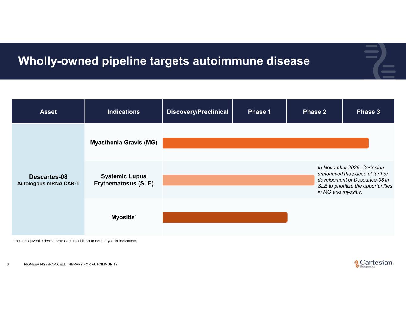 PIONEERING mRNA CELL THERAPY FOR AUTOIMMUNITY5 Cartesian’s mRNA approach is designed to expand the reach of potent cell therapy products to address autoimmunity No Lymphodepletion No associated cytopenia, secondary malignancies, or other chemotherapy toxicities Administered Outpatient Convenient dosing schedule Delivered at Therapeutic Levels Administered at therapeutic doses without uncontrollable proliferation Transient Cell Modification Does not carry risk of genomic integration