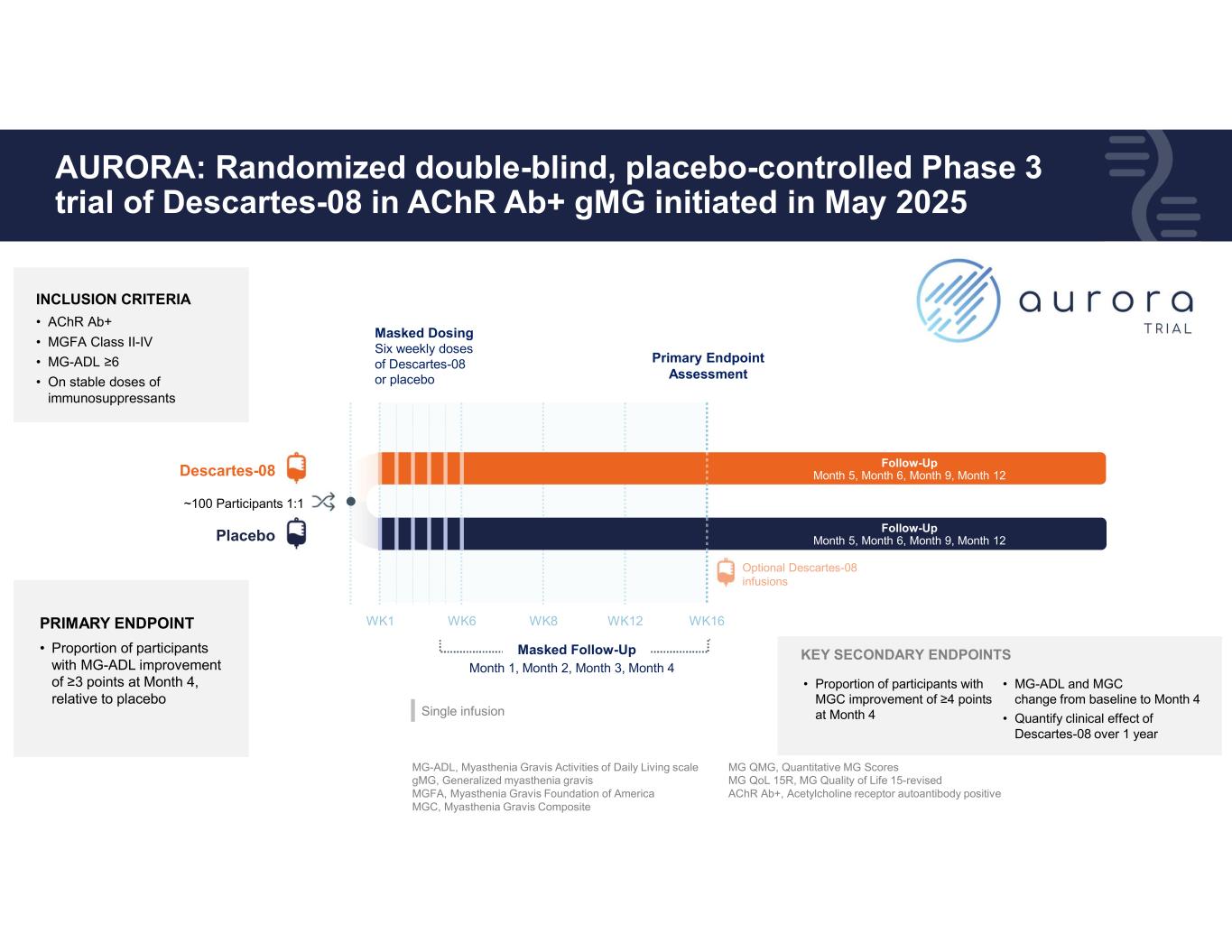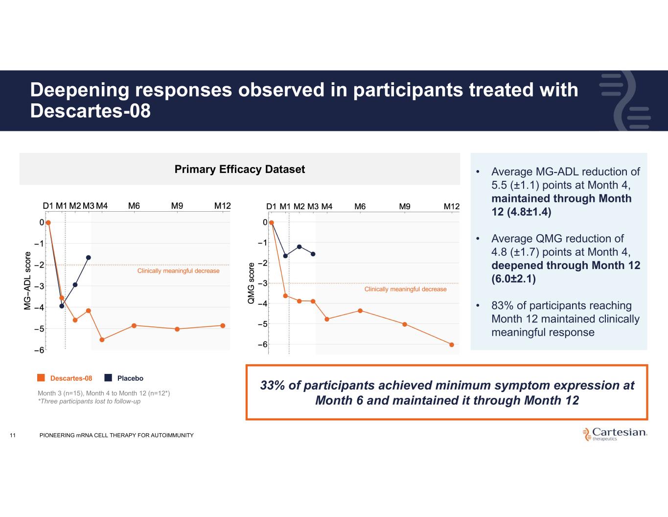 10 AURORA: Randomized double-blind, placebo-controlled Phase 3 trial of Descartes-08 in AChR Ab+ gMG initiated in May 2025 WK1 Masked Dosing Six weekly doses of Descartes-08 or placebo PRIMARY ENDPOINT • Proportion of participants with MG-ADL improvement of ≥3 points at Month 4, relative to placebo • Proportion of participants with MGC improvement of ≥4 points at Month 4 WK6 WK8 WK12 WK16 Masked Follow-Up Month 1, Month 2, Month 3, Month 4 Primary Endpoint Assessment Optional Descartes-08 infusions Follow-Up Month 5, Month 6, Month 9, Month 12 Follow-Up Month 5, Month 6, Month 9, Month 12Descartes-08 Placebo ~100 Participants 1:1 INCLUSION CRITERIA • AChR Ab+ • MGFA Class II-IV • MG-ADL ≥6 • On stable doses of immunosuppressants Single infusion MG-ADL, Myasthenia Gravis Activities of Daily Living scale gMG, Generalized myasthenia gravis MGFA, Myasthenia Gravis Foundation of America MGC, Myasthenia Gravis Composite MG QMG, Quantitative MG Scores MG QoL 15R, MG Quality of Life 15-revised AChR Ab+, Acetylcholine receptor autoantibody positive KEY SECONDARY ENDPOINTS • MG-ADL and MGC change from baseline to Month 4 • Quantify clinical effect of Descartes-08 over 1 year PIONEERING mRNA CELL THERAPY FOR AUTOIMMUNITY