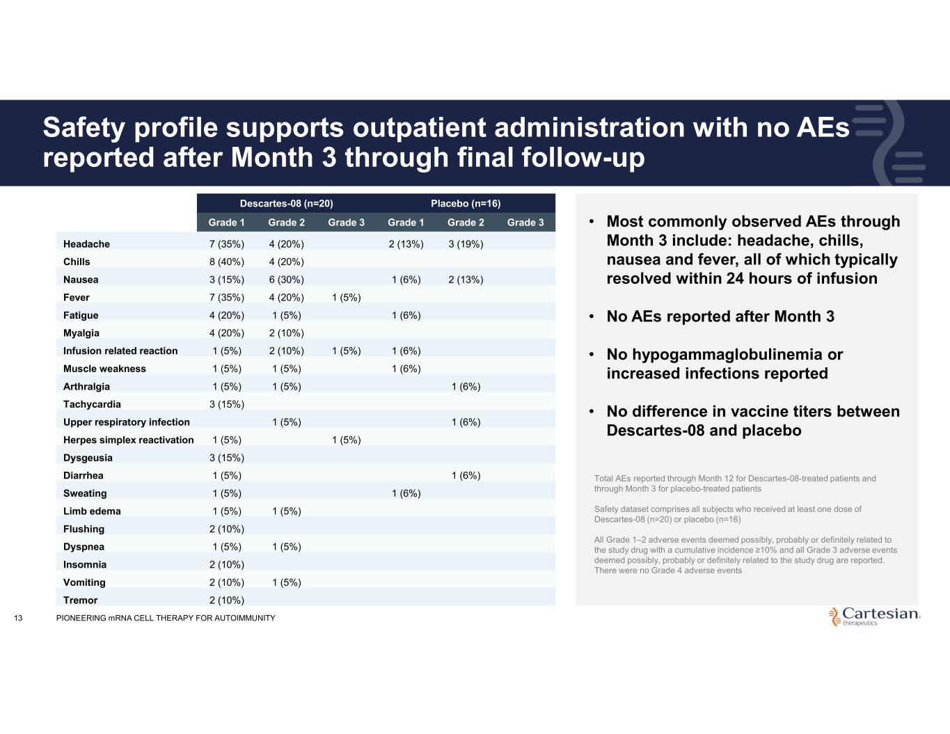 Deep responses observed in participants with no prior exposure to complement or FcRn inhibitors 12 • Average MG-ADL reduction of 6.6 (±1.5) points at Month 4, maintained through Month 12 (7.1±1.9) • Average QMG reduction of 5.9 (±2.4) points at Month 4, deepened through Month 12 (9.4±2.6) • 100% of participants maintained clinically meaningful response at Month 12 Primary Efficacy Dataset (No Prior Biologics) Month 3 (n=9), Month 4 (n=7*), Month 6 (n=7), Month 9 (n=7), Month 12 (n=7) *Two participants lost to follow-up Descartes-08 Clinically meaningful decrease Clinically meaningful decrease 57% of participants achieved minimum symptom expression at Month 6 and maintained it through Month 12 PIONEERING mRNA CELL THERAPY FOR AUTOIMMUNITY