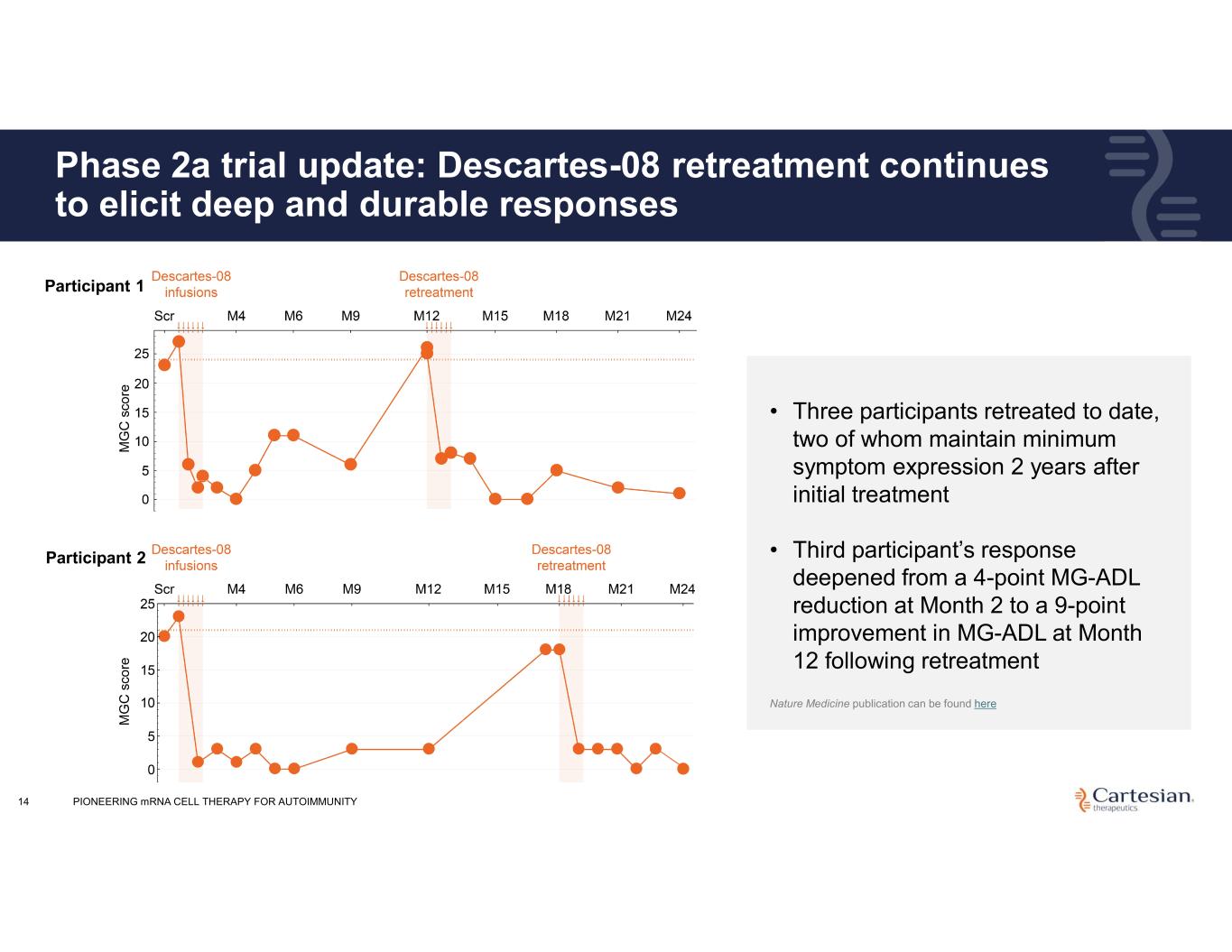 13 Safety profile supports outpatient administration with no AEs reported after Month 3 through final follow-up Placebo (n=16)Descartes-08 (n=20) Grade 3Grade 2Grade 1Grade 3Grade 2Grade 1 3 (19%)2 (13%)4 (20%)7 (35%)Headache 4 (20%)8 (40%)Chills 2 (13%)1 (6%)6 (30%)3 (15%)Nausea 1 (5%)4 (20%)7 (35%)Fever 1 (6%)1 (5%)4 (20%)Fatigue 2 (10%)4 (20%)Myalgia 1 (6%)1 (5%)2 (10%)1 (5%)Infusion related reaction 1 (6%)1 (5%)1 (5%)Muscle weakness 1 (6%)1 (5%)1 (5%)Arthralgia 3 (15%)Tachycardia 1 (6%)1 (5%)Upper respiratory infection 1 (5%)1 (5%)Herpes simplex reactivation 3 (15%)Dysgeusia 1 (6%)1 (5%)Diarrhea 1 (6%)1 (5%)Sweating 1 (5%)1 (5%)Limb edema 2 (10%)Flushing 1 (5%)1 (5%)Dyspnea 2 (10%)Insomnia 1 (5%)2 (10%)Vomiting 2 (10%)Tremor • Most commonly observed AEs through Month 3 include: headache, chills, nausea and fever, all of which typically resolved within 24 hours of infusion • No AEs reported after Month 3 • No hypogammaglobulinemia or increased infections reported • No difference in vaccine titers between Descartes-08 and placebo Total AEs reported through Month 12 for Descartes-08-treated patients and through Month 3 for placebo-treated patients Safety dataset comprises all subjects who received at least one dose of Descartes-08 (n=20) or placebo (n=16) All Grade 1–2 adverse events deemed possibly, probably or definitely related to the study drug with a cumulative incidence ≥10% and all Grade 3 adverse events deemed possibly, probably or definitely related to the study drug are reported. There were no Grade 4 adverse events PIONEERING mRNA CELL THERAPY FOR AUTOIMMUNITY