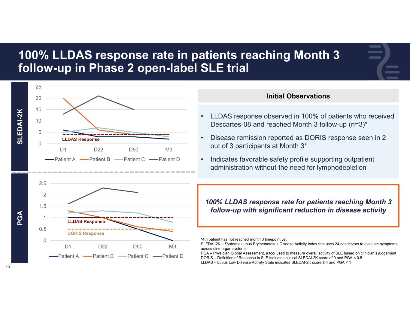 18 Exploring clinical activity of Descartes-08 in SLE through open-label Phase 2 trial Screening (Days -60 to -15) Leukapheresis & Cell Processing (Days -59 to -14) ~3 Weeks Vein-to-Vein Time Descartes-08 (Day 1, 8, 15, 22, 29, 36) Safety / Response Assessment (Day 50) Follow up visits (Months 3, 6, 9, 12) INCLUSION CRITERIA • Up to 30 adults with moderate to severe multi-refractory SLE and no CNS involvement PRIMARY ENDPOINT • Assess safety tolerability and manufacturing feasibility of Descartes-08 in patients with SLE SECONDARY ENDPOINTS • Standard measures of clinical activity: • SLE Activity Index (SLEDAI-2K) • Physician Global Assessment (PGA) • Lupus Low Disease Activity State (LLDAS) • Definition of Remission in SLE (DORIS) PIONEERING mRNA CELL THERAPY FOR AUTOIMMUNITY CNS, Central nervous system