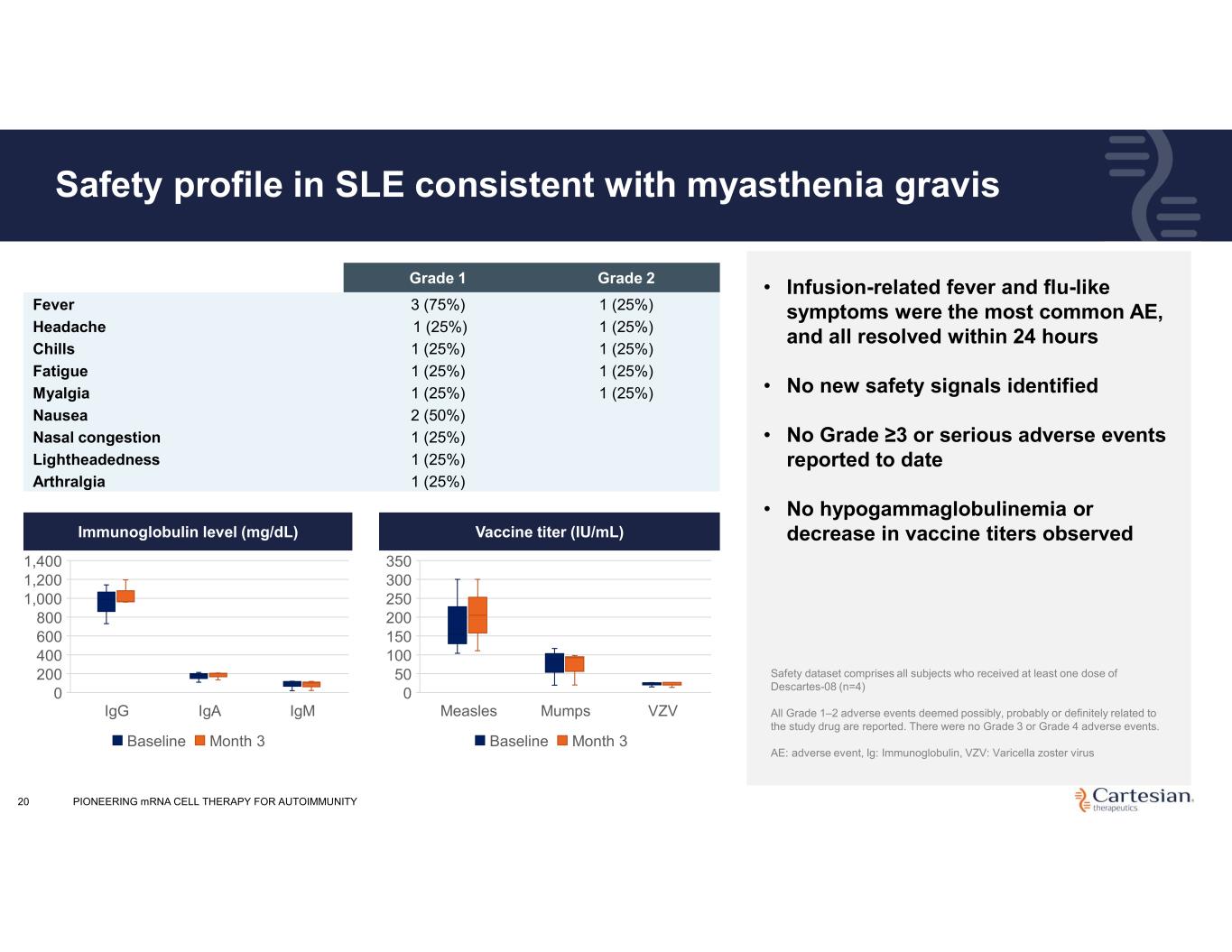 19 100% LLDAS response rate in patients reaching Month 3 follow-up in Phase 2 open-label SLE trial • LLDAS response observed in 100% of patients who received Descartes-08 and reached Month 3 follow-up (n=3)* • Disease remission reported as DORIS response seen in 2 out of 3 participants at Month 3* • Indicates favorable safety profile supporting outpatient administration without the need for lymphodepletion *4th patient has not reached month 3 timepoint yet SLEDAI-2K – Systemic Lupus Erythematosus Disease Activity Index that uses 24 descriptors to evaluate symptoms across nine organ systems PGA – Physician Global Assessment, a tool used to measure overall activity of SLE based on clinician’s judgement DORIS – Definition of Response in SLE indicates clinical SLEDAI-2K score of 0 and PGA < 0.5 LLDAS – Lupus Low Disease Activity State indicates SLEDAI-2K score ≤ 4 and PGA < 1 100% LLDAS response rate for patients reaching Month 3 follow-up with significant reduction in disease activity S L E D A I- 2 K P G A Initial Observations 0 5 10 15 20 25 D1 D22 D50 M3 Patient A Patient B Patient C Patient D 0 0.5 1 1.5 2 2.5 D1 D22 D50 M3 Patient A Patient B Patient C Patient D LLDAS Response LLDAS Response DORIS Response