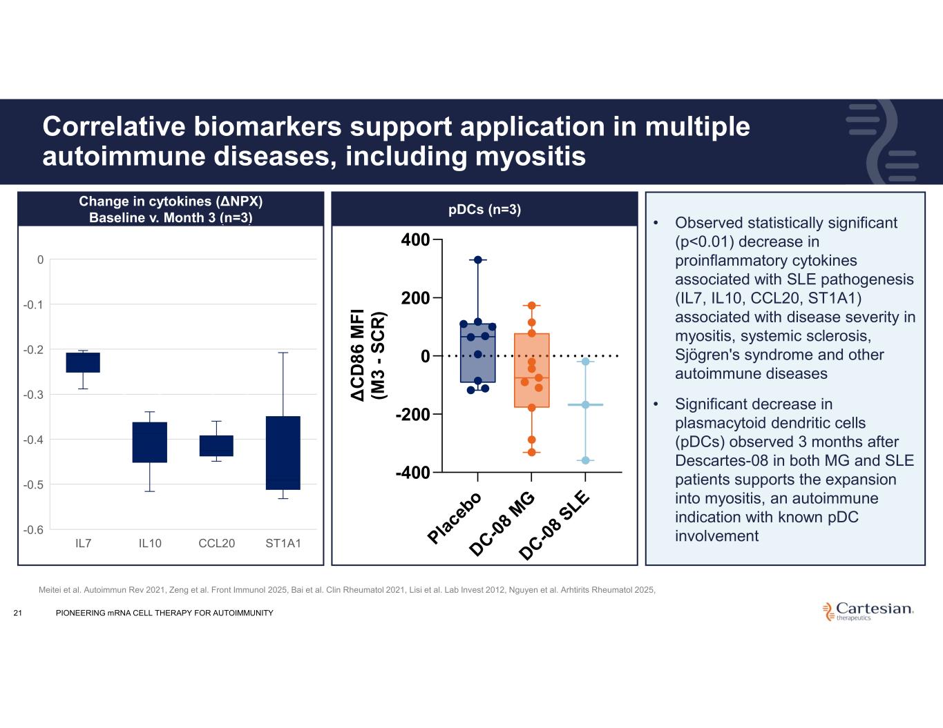 Pla ce bo DC-0 8 M G DC-0 8 SLE -400 -200 0 200 400 pDCs Δ C D 8 6 M F I (M 3 - S C R ) 21 Correlative biomarkers support application in multiple autoimmune diseases, including myositis • Observed statistically significant (p<0.01) decrease in proinflammatory cytokines associated with SLE pathogenesis (IL7, IL10, CCL20, ST1A1) associated with disease severity in myositis, systemic sclerosis, Sjögren's syndrome and other autoimmune diseases • Significant decrease in plasmacytoid dendritic cells (pDCs) observed 3 months after Descartes-08 in both MG and SLE patients supports the expansion into myositis, an autoimmune indication with known pDC involvement IL7 IL10 CCL20 ST1A1 0 -0.1 -0.2 -0.3 -0.4 -0.5 -0.6 Change in cytokines (ΔNPX) Baseline v. Month 3 (n=3) Meitei et al. Autoimmun Rev 2021, Zeng et al. Front Immunol 2025, Bai et al. Clin Rheumatol 2021, Lisi et al. Lab Invest 2012, Nguyen et al. Arhtirits Rheumatol 2025, pDCs (n=3) Change in cytokines (ΔNPX) Baseline v. Month 3 PIONEERING mRNA CELL THERAPY FOR AUTOIMMUNITY