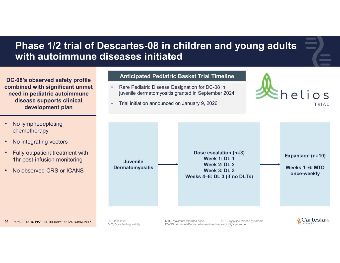 25 Myositis seamless clinical trial design provides potential opportunity for single pivotal trial to commence in 1H26 Screening Days -60 to -18 Leukapheresis & Cell Processing Days -59 to -17 ~3 Weeks Vein-to-Vein Time Descartes-08 Day 1, 8, 15, 22, 29, 36 Follow-Up Visits Weeks 8, 12, 16 Primary Endpoint Assessment Week 24 Placebo Day 1, 8, 15, 22, 29, 36 ~3 Weeks Vein-to-Vein Time 1:1 randomization Days -7 to -3 Preliminary analysis following initial ten patients to evaluate shift into pivotal trial INCLUSION CRITERIA • Adults with moderate to severe multi-refractory dermatomyositis and antisynthetase syndrome PRIMARY OBJECTIVE • Assess safety and efficacy of Descartes-08 compared to placebo added to standard of care in patients with myositis SAMPLE SIZE • 10 participants prior to interim analysis • Up to 50 participants total (25 each arm)