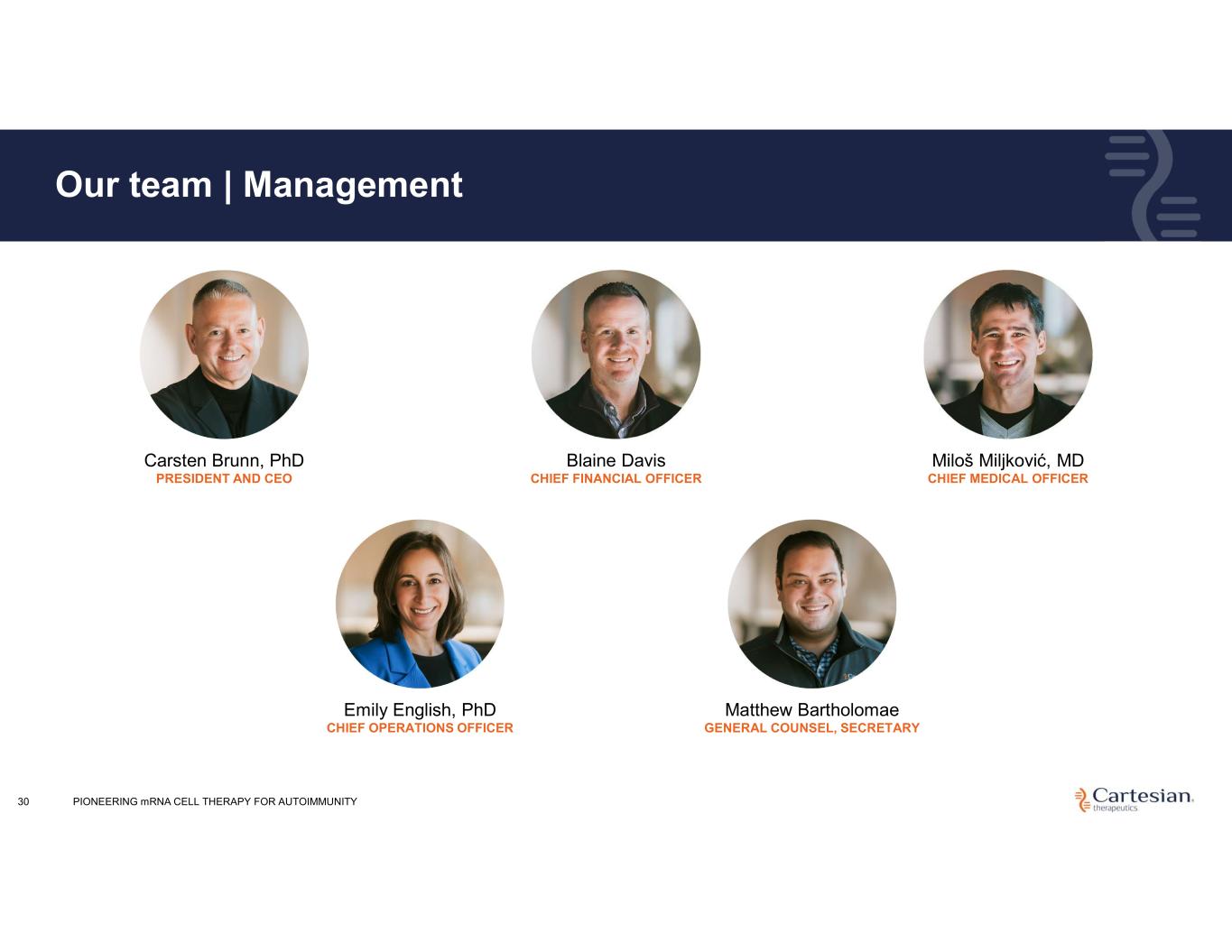 PIONEERING mRNA CELL THERAPY FOR AUTOIMMUNITY30 Our team | Management Carsten Brunn, PhD PRESIDENT AND CEO Blaine Davis CHIEF FINANCIAL OFFICER Miloš Miljković, MD CHIEF MEDICAL OFFICER Emily English, PhD CHIEF OPERATIONS OFFICER Matthew Bartholomae GENERAL COUNSEL, SECRETARY