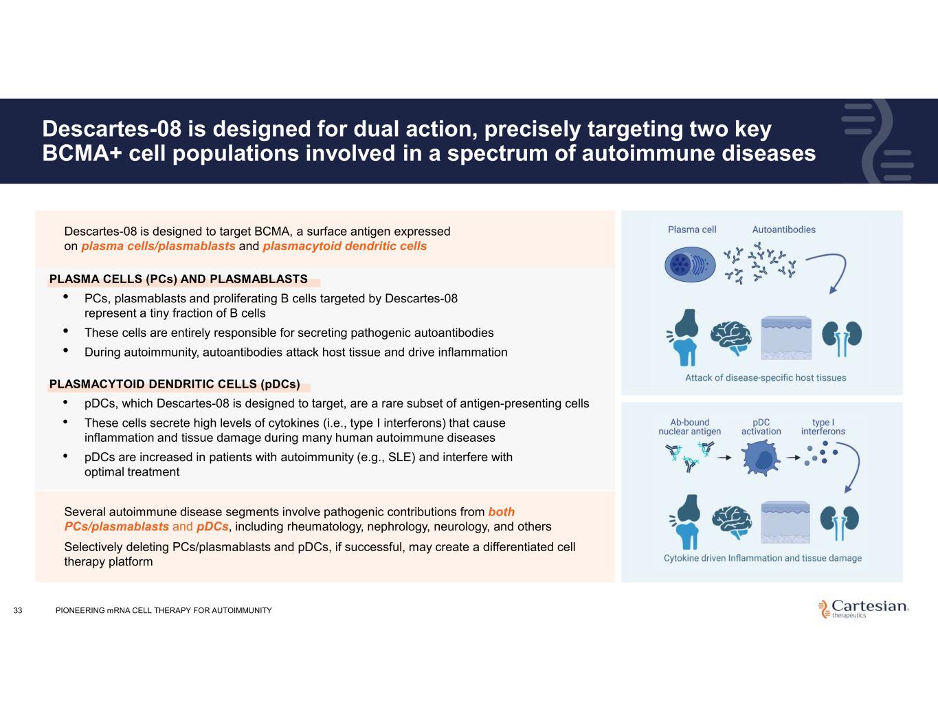 Descartes-08 is designed for dual action, precisely targeting two key BCMA+ cell populations involved in a spectrum of autoimmune diseases 33 Several autoimmune disease segments involve pathogenic contributions from both PCs/plasmablasts and pDCs, including rheumatology, nephrology, neurology, and others Selectively deleting PCs/plasmablasts and pDCs, if successful, may create a differentiated cell therapy platform • Descartes-08 is designed to target BCMA, a surface antigen expressed on plasma cells/plasmablasts and plasmacytoid dendritic cells PLASMA CELLS (PCs) AND PLASMABLASTS • PCs, plasmablasts and proliferating B cells targeted by Descartes-08 represent a tiny fraction of B cells • These cells are entirely responsible for secreting pathogenic autoantibodies • During autoimmunity, autoantibodies attack host tissue and drive inflammation PLASMACYTOID DENDRITIC CELLS (pDCs) • pDCs, which Descartes-08 is designed to target, are a rare subset of antigen-presenting cells • These cells secrete high levels of cytokines (i.e., type I interferons) that cause inflammation and tissue damage during many human autoimmune diseases • pDCs are increased in patients with autoimmunity (e.g., SLE) and interfere with optimal treatment PIONEERING mRNA CELL THERAPY FOR AUTOIMMUNITY